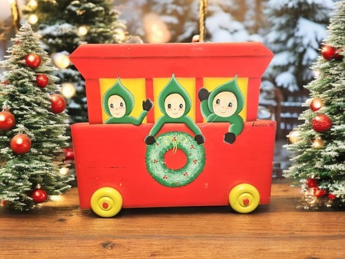 UP FOR SALE: VTG Hand Painted Christmas Train Caboose Pixies Folk Art Design by Marie Cole