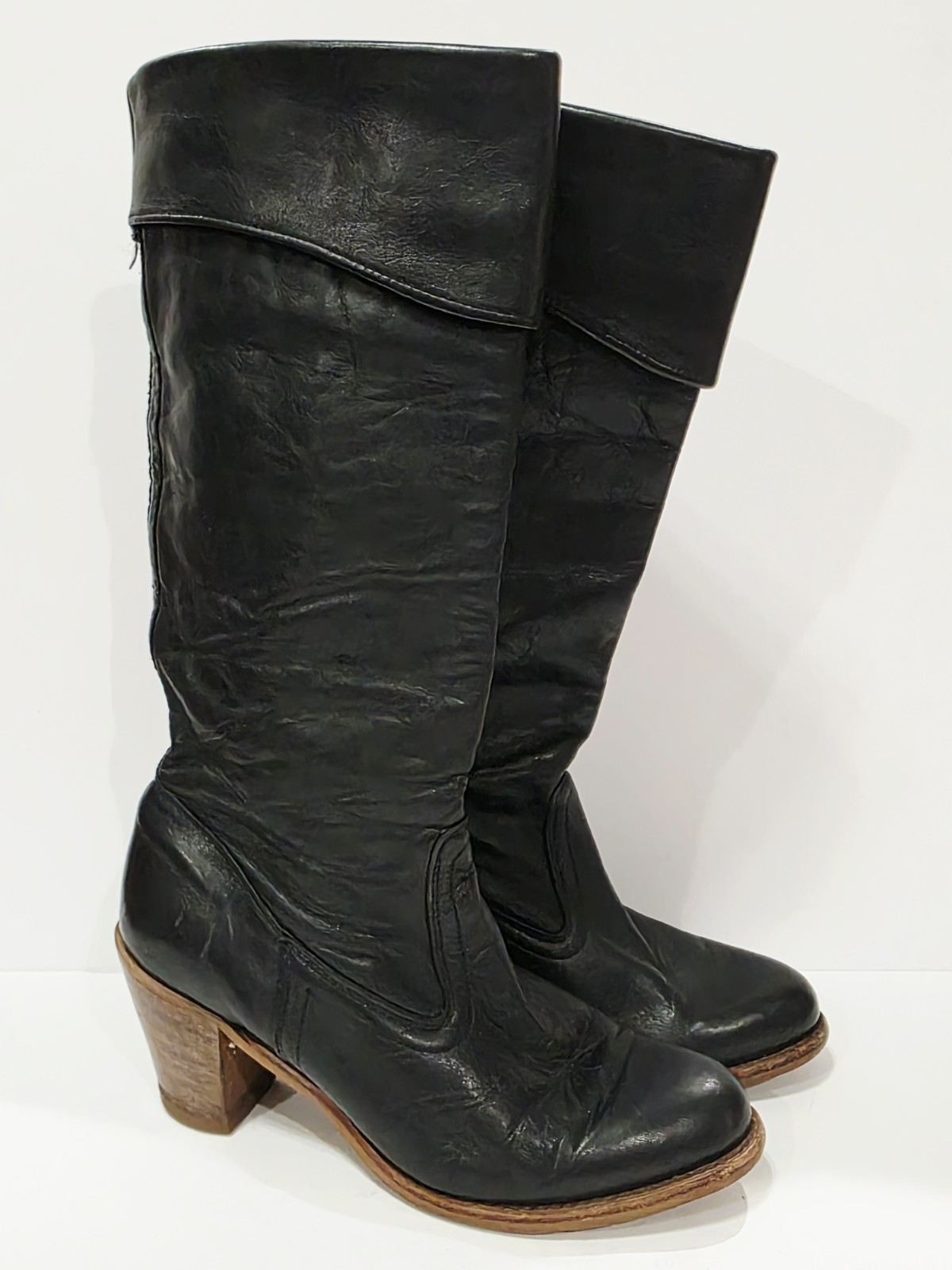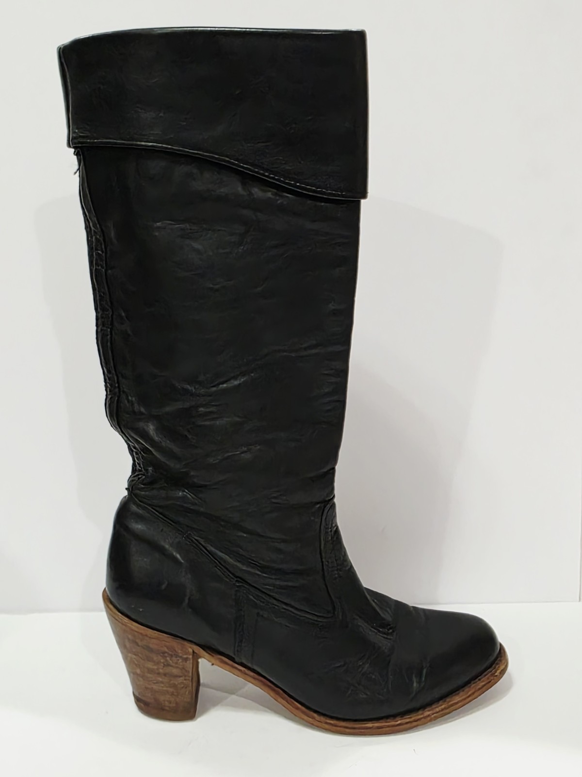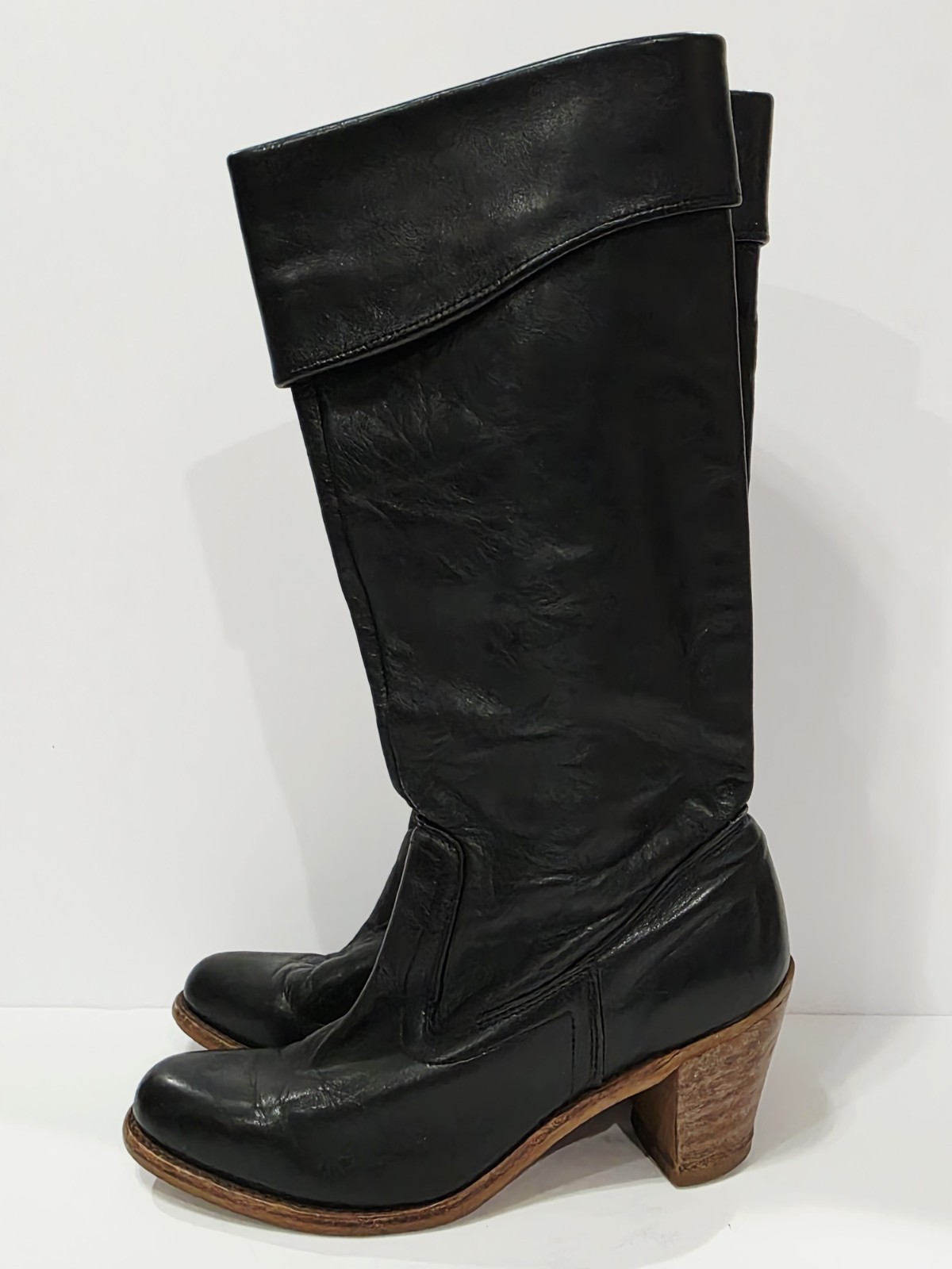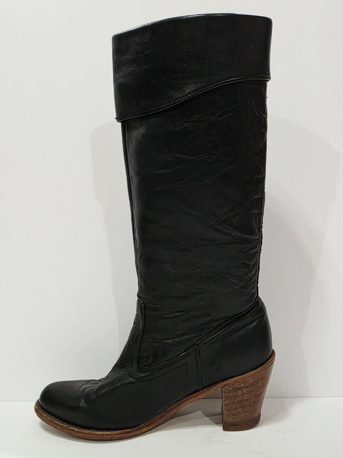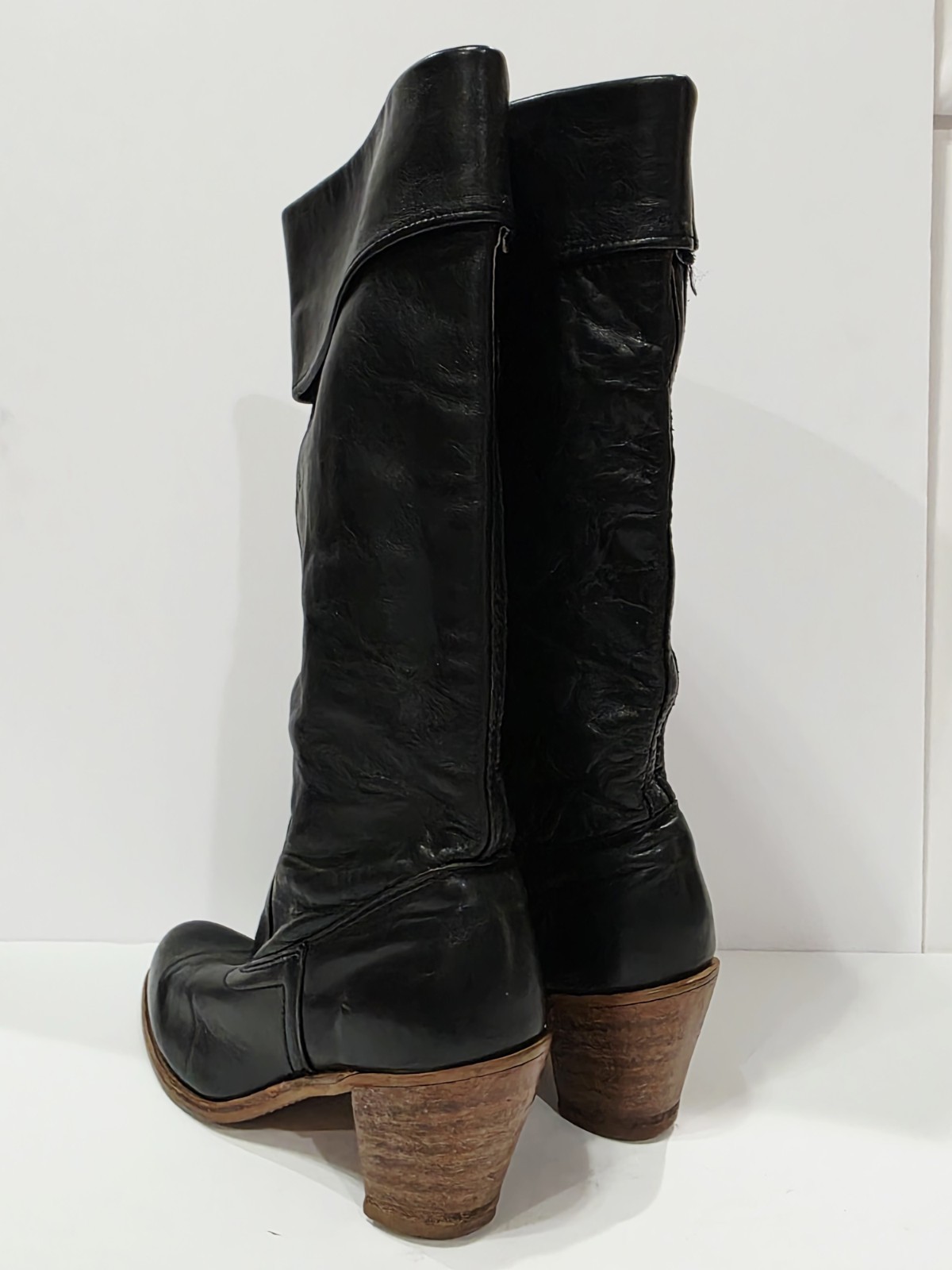 1 Used Pair No Box By Dexter 708802 Black Leather Boot Mid-Calf Cuff Pull-On Vintage Riding Wood Block Heel Women 7 M Used! (Box #5)