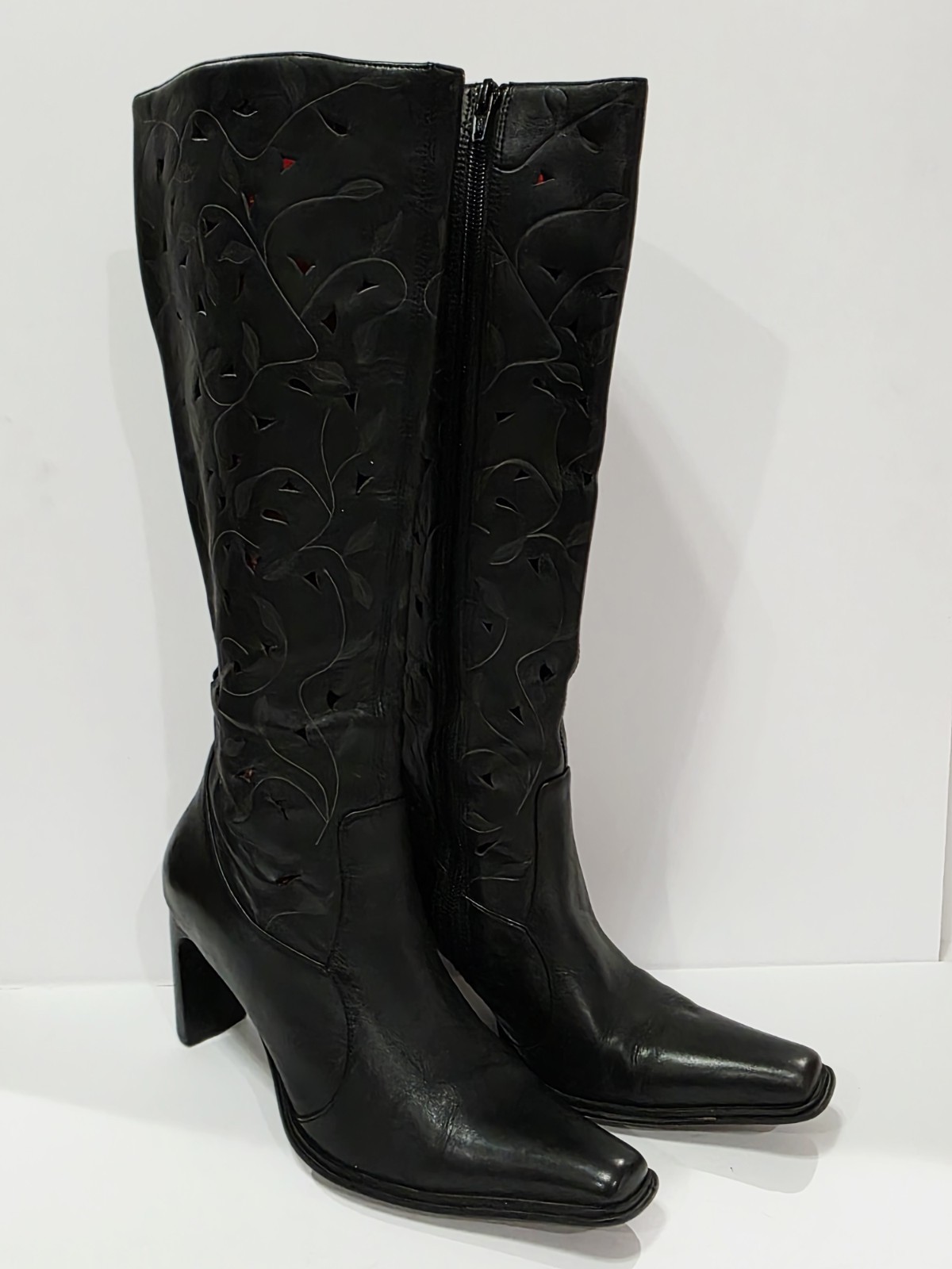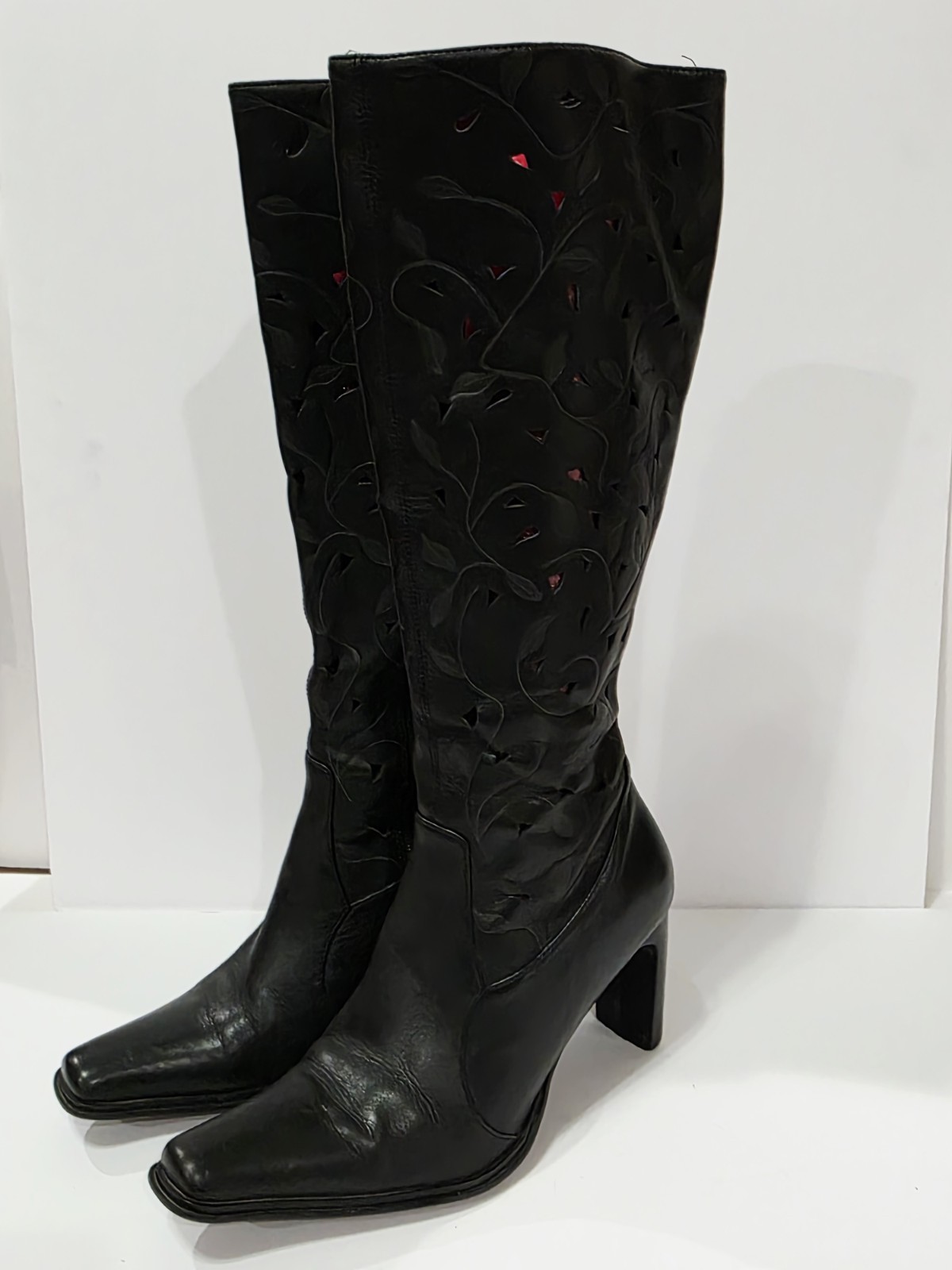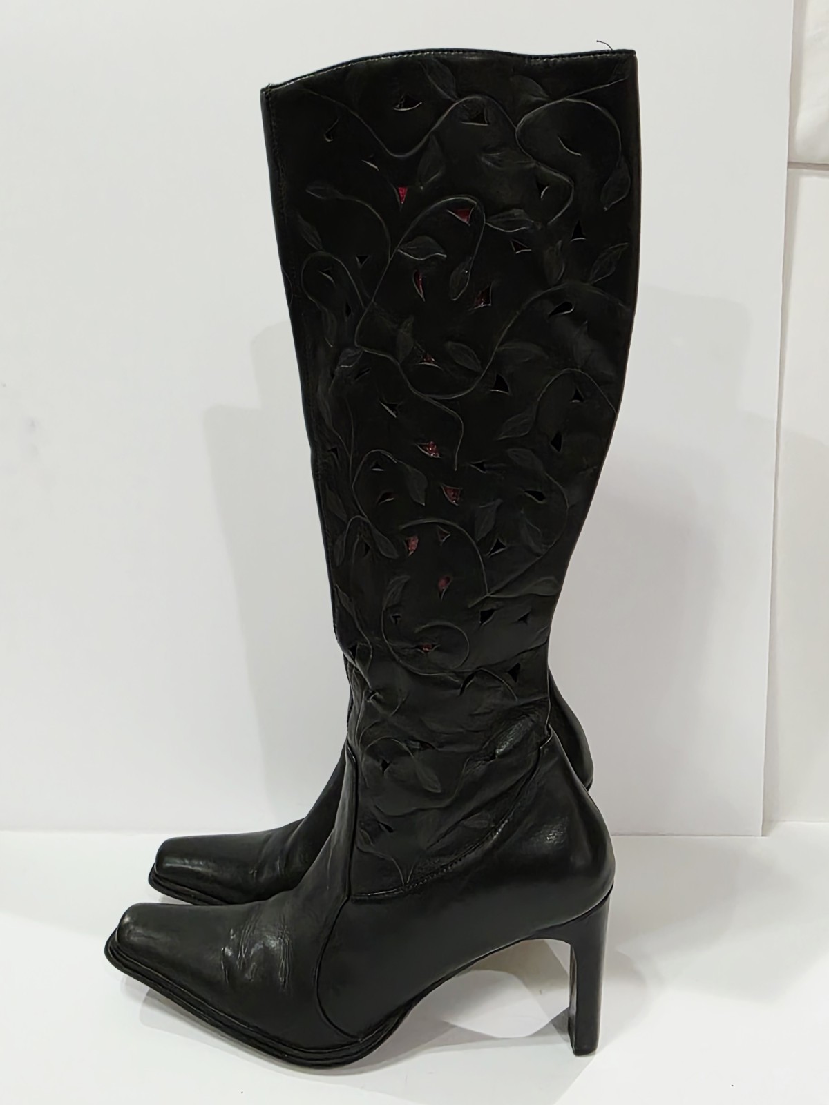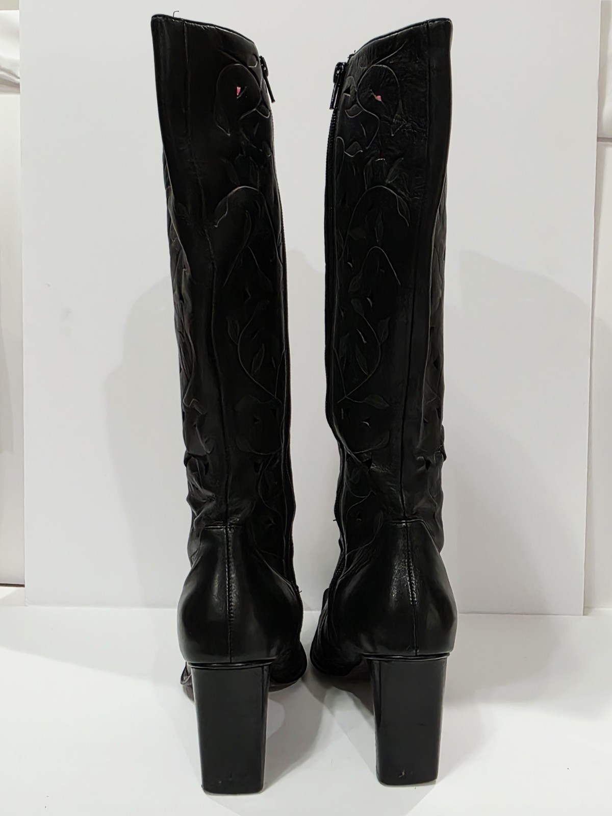 1 Slightly Used Pair No Box By Mia DEACON C4607 Cut-Out Black Leather Heel Boot Knee High Floral Embroidered Zipper Closure Women 7 M Used! (Box #5)