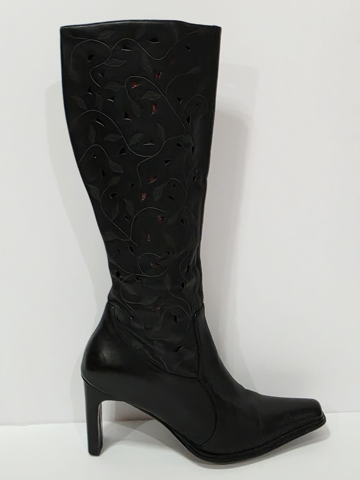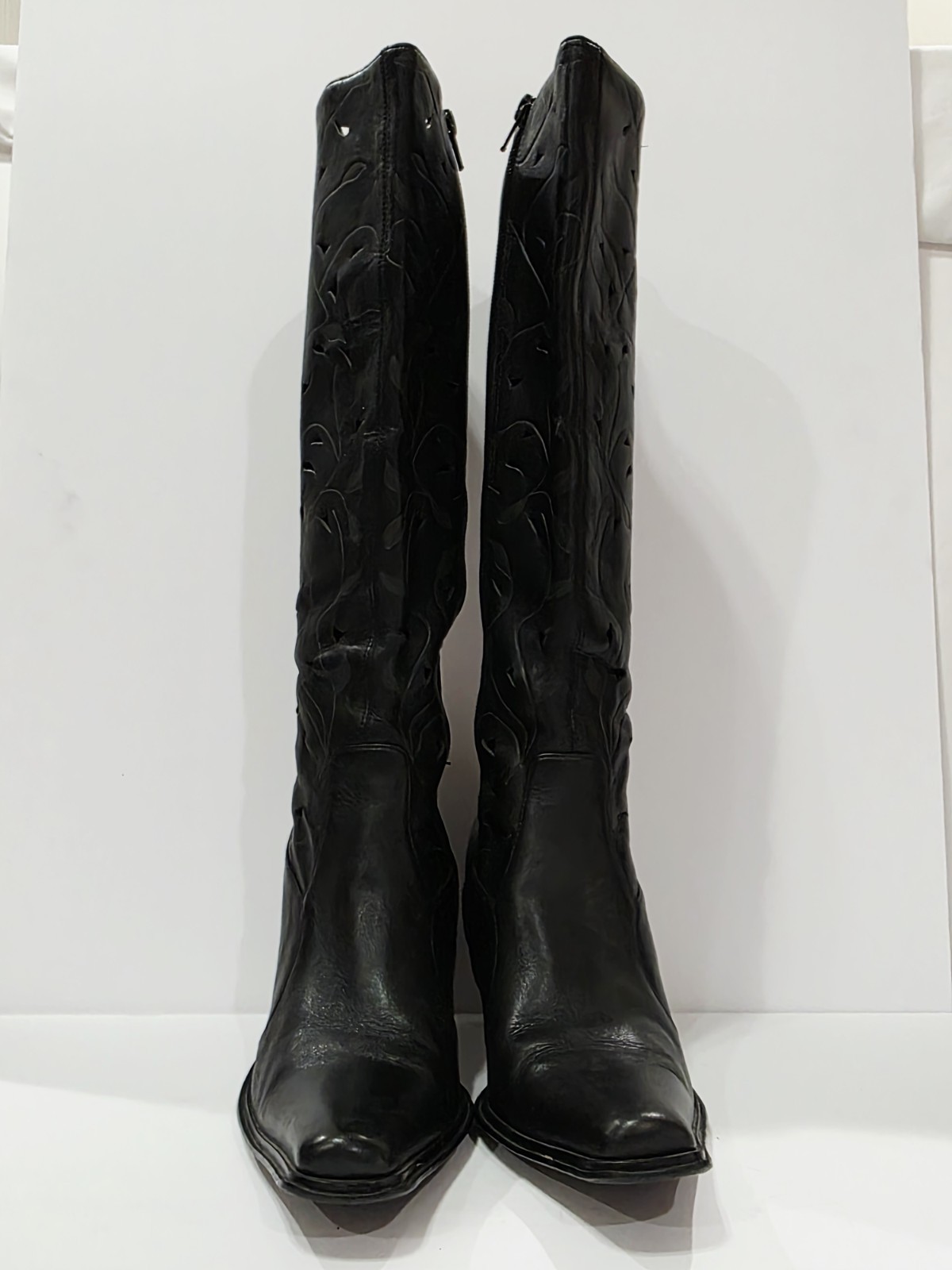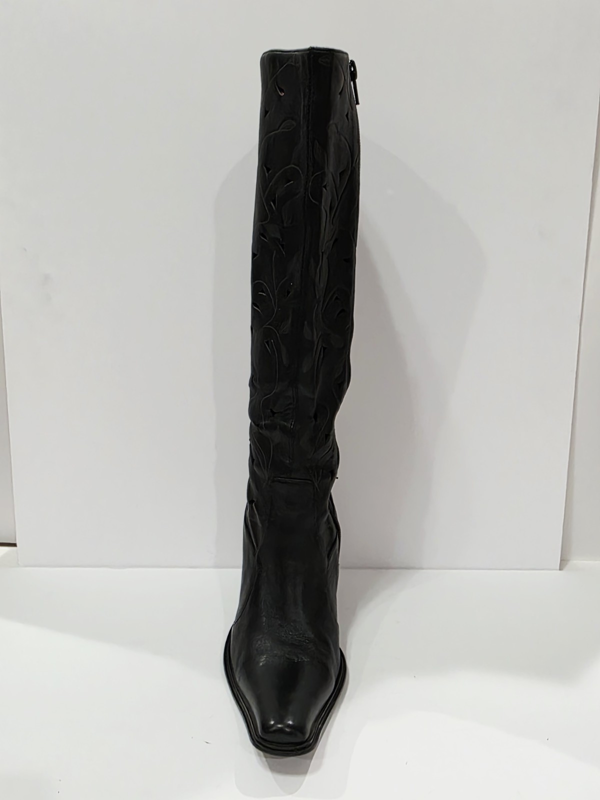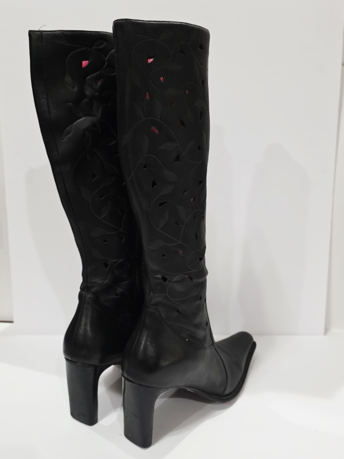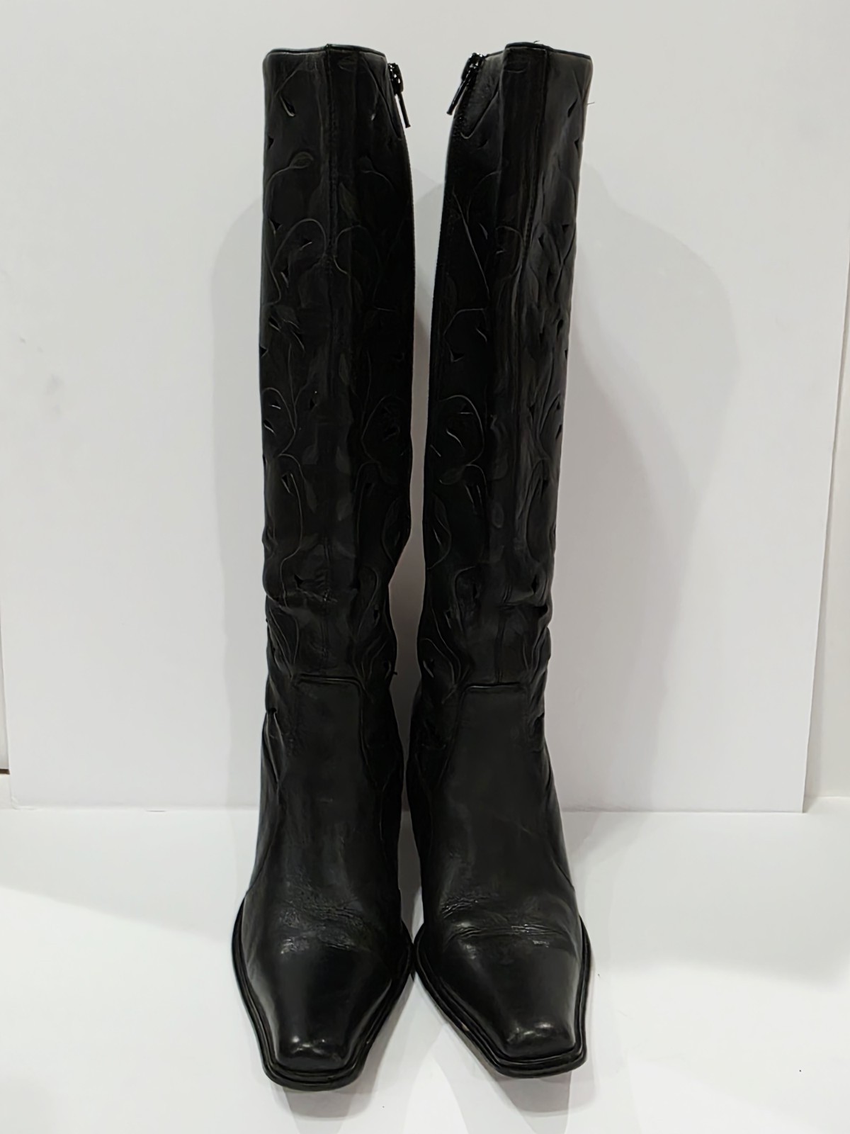 1 Slightly Used Pair No Box By Mia DEACON C4607 Cut-Out Black Leather Heel Boot Knee High Floral Embroidered Zipper Closure Women 7 M Used! (Box #5)
