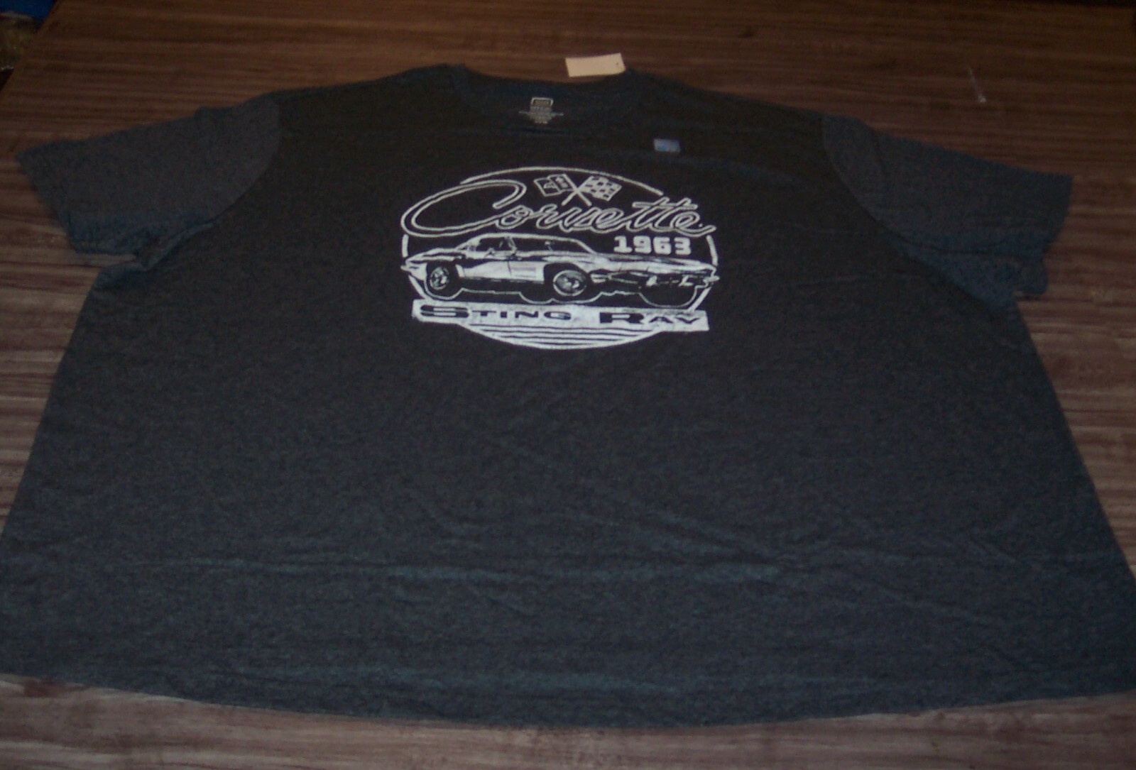 This is a VINTAGE STYLE 1963 CORVETTE GM CHEVROLET STING RAY T-shirt. It is a size Big and Tall 4XB, and it is NEW w/ TAG. It is 33 inches from armpit to armpit and 34 inches in length. The print is made to look vintage. Combine auctions to save on shipping. AD