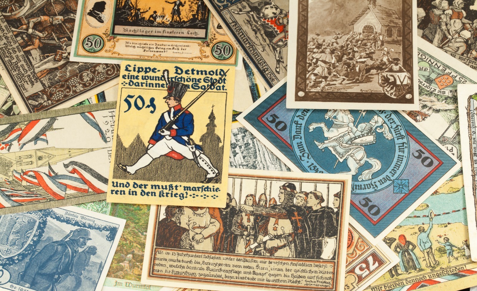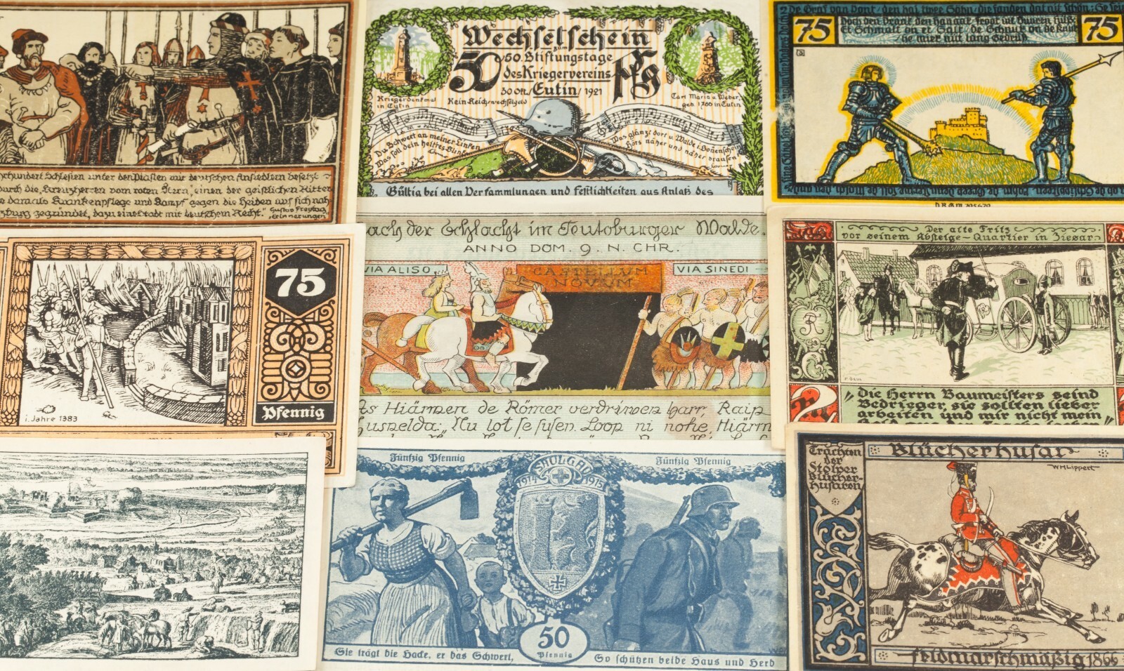 Ce lot comprendra 25 notes de notgeld individuelles d'Allemagne apres la Premiere Guerre mondiale. Valeurs faciales entre 5 pfennig a 5 marque. Theme militaire et politique.