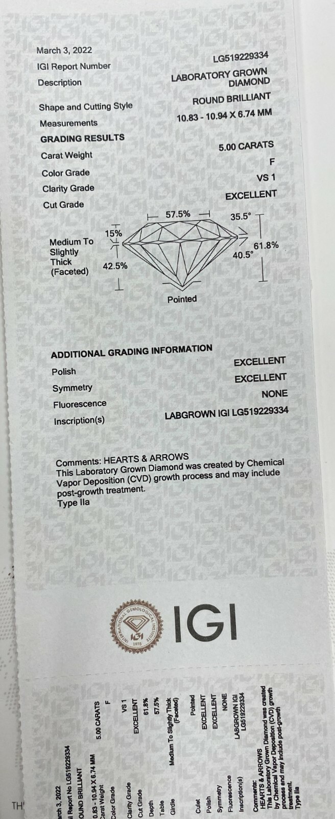 5,00 CT CVD Lab Laborau cultive Diamond F VS1 IGI Certified
