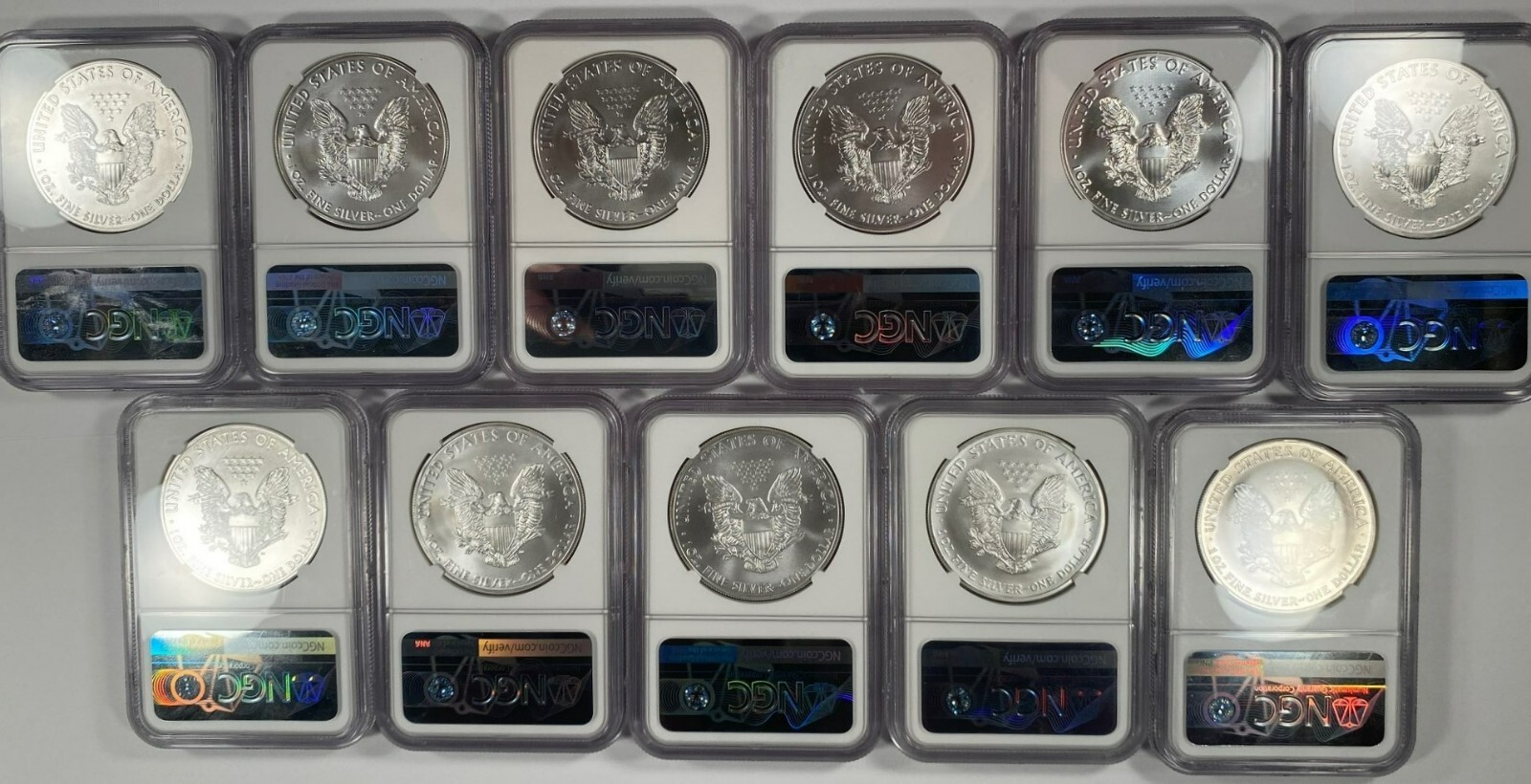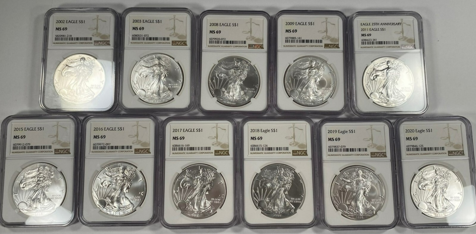 Lotto Di 11 Silver American Eagles Graded Da NGC Come MS-69 (Vedi Dettagli)