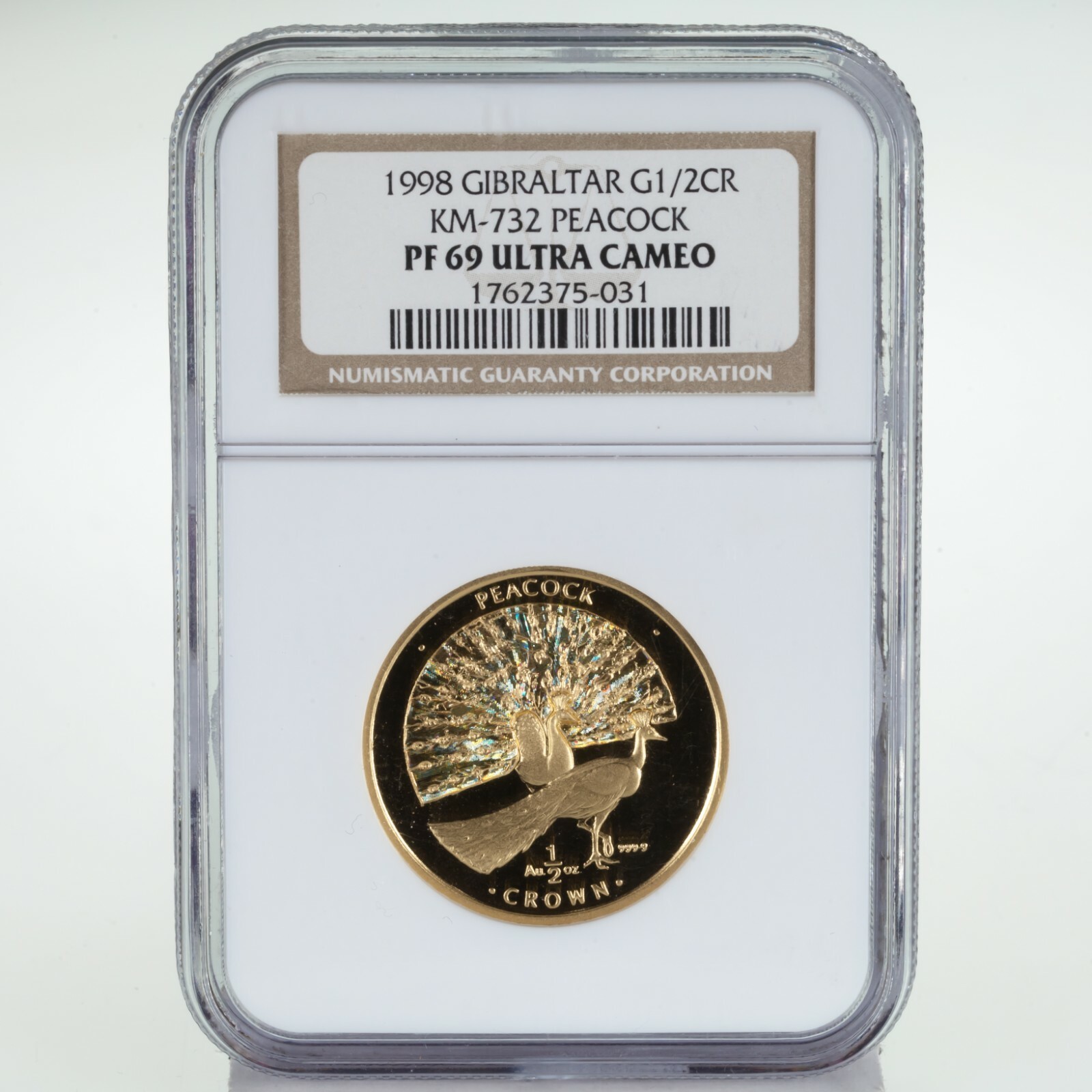 1998 Gibilterra 1/2 Oz. .9999 Oro 1/2 Corona Pavone NGC PF69 Ultra Cameo KM-732