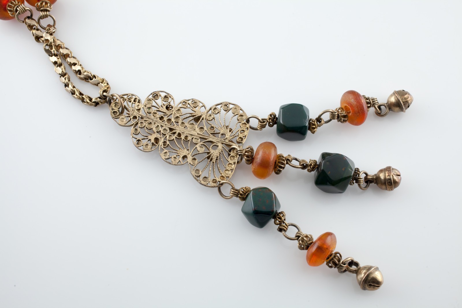 Plaqué Or Bédouin Filigrane Collier Ambre Et Pierre de Sang Magnifique