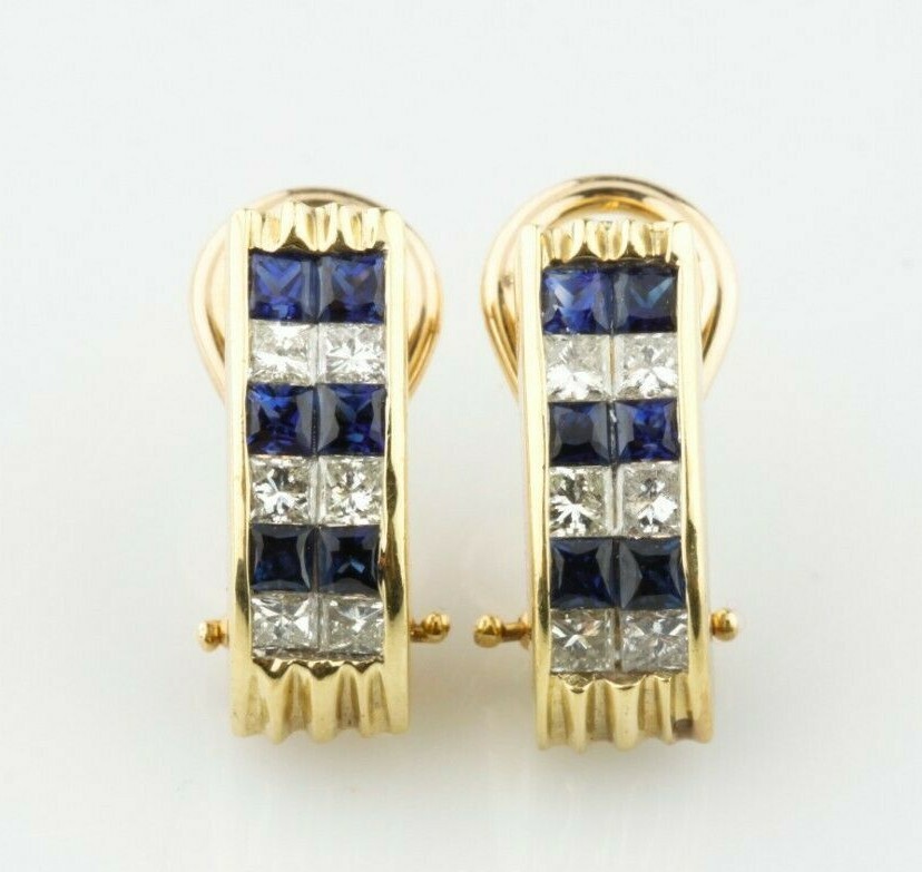Une paire testee electronique a 14 kt en or jaune foncees et boucles d'oreilles saphir et diamant assemblees avec dos omega