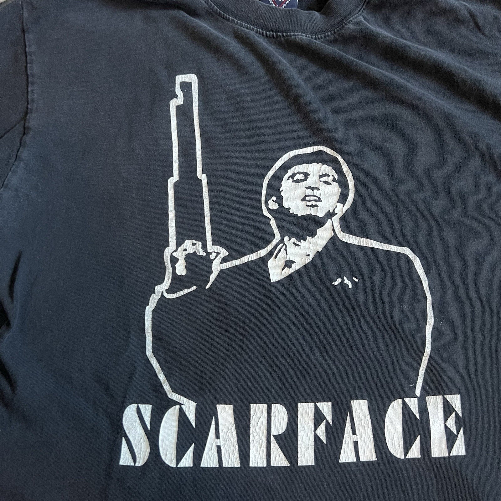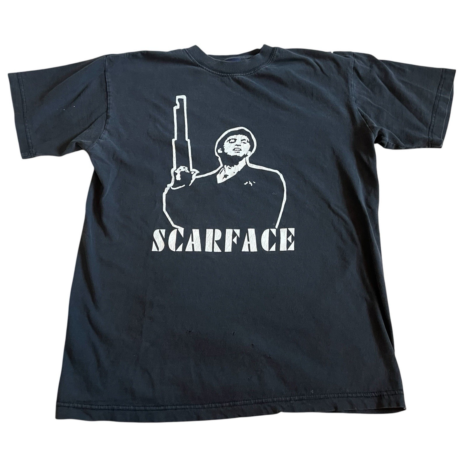 Vintage Scarface Tony Montana Stencil T Shirt Sz M Black Thrashed Y2K US.T’s Tag