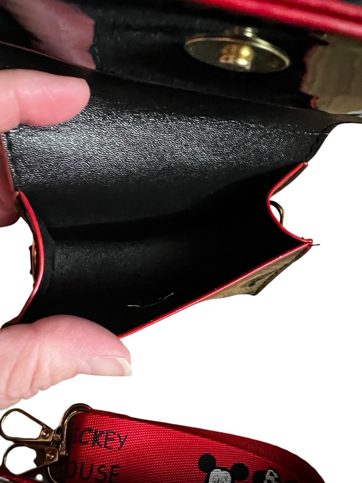 ? Adjustable and detachable red strap featuring Mickey and Minnie Mouse faces