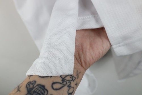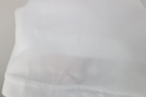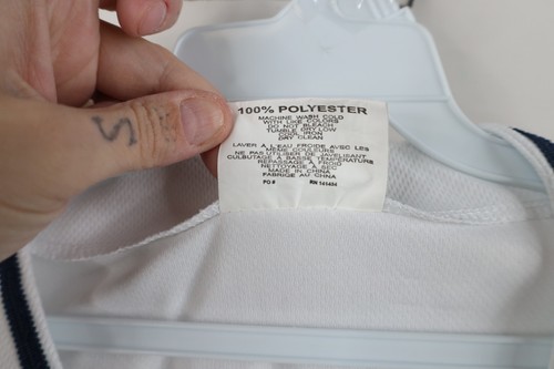 Blemishes/dark spots front. Loose threads collar, bottom hem. Collar, arms discolored. Yellowed. Graphics faded