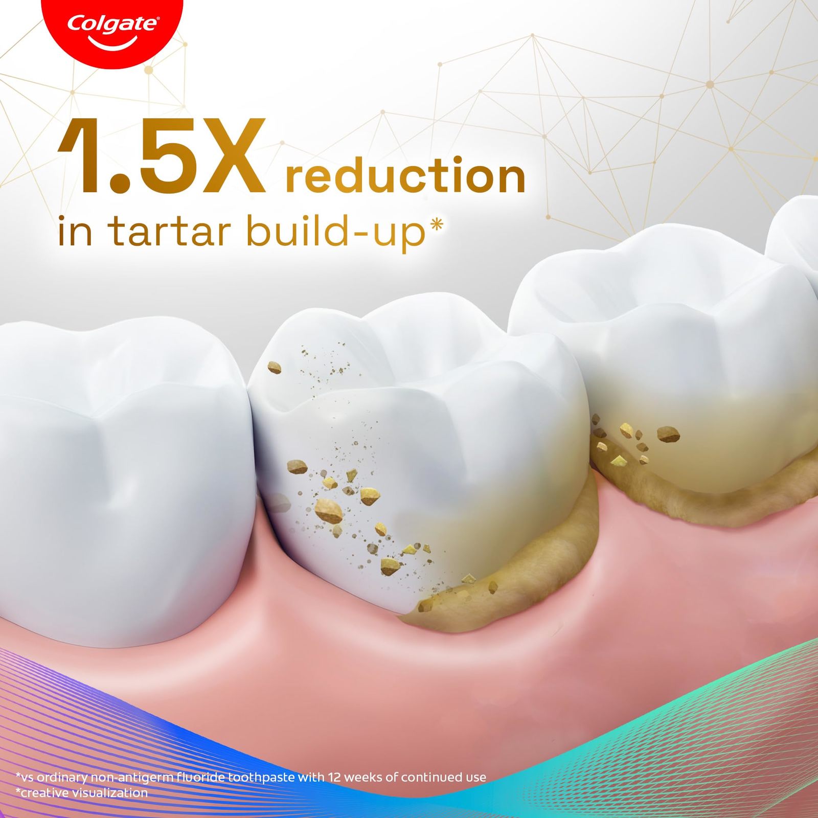 Product description: Colgate Total Anti-Tartar Toothpaste provides you 1.5x Better Tartar Reduction vs. ordinary non-antigerm fluoride toothpaste with 12 weeks of continued use. This Anti-Germ Tooth paste fights root causes of Cavities, Plaque, Tartar, Sensitivity, Enamel Erosion, Stains, Bad Breath Gum Problems.