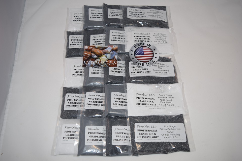 This Kit contains enough grit to polish Five batches of stones in a 3 lb. tumbler.