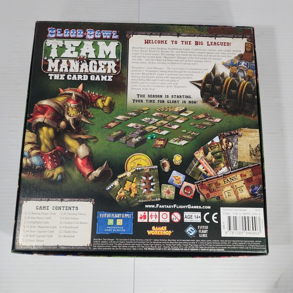 Blood Bowl Team Manager The Card Game by Fantasy Flight Games is a complete board game released in 2011. With a fantasy theme based on Warhammer 40K, this game is suitable for players aged 14 and up. It offers a competitive gameplay experience for 2 players, making it a great choice for both boys and girls who enjoy strategic card games. Made in China, this 100% complete game promises hours of entertainment for fans of the Warhammer universe.