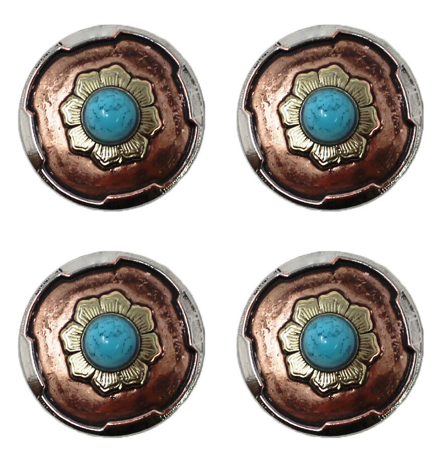 Set of 4 screw back conchos. Feature a copper flower with turquoise accents. Measures 1 1/4" (32 mm) in diameter. Easy to install with chicago screws included. Beautifully accents any tack, saddle, belt, etc.
