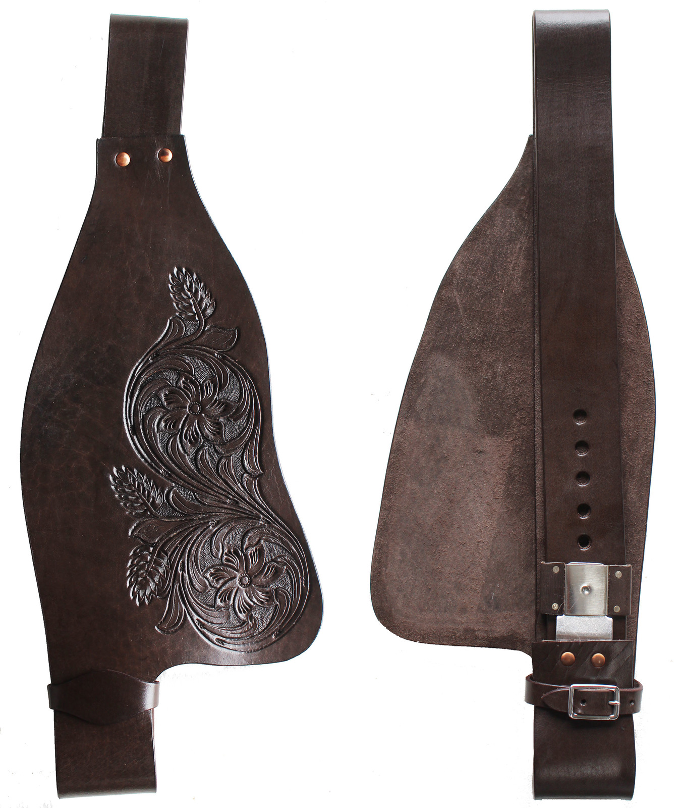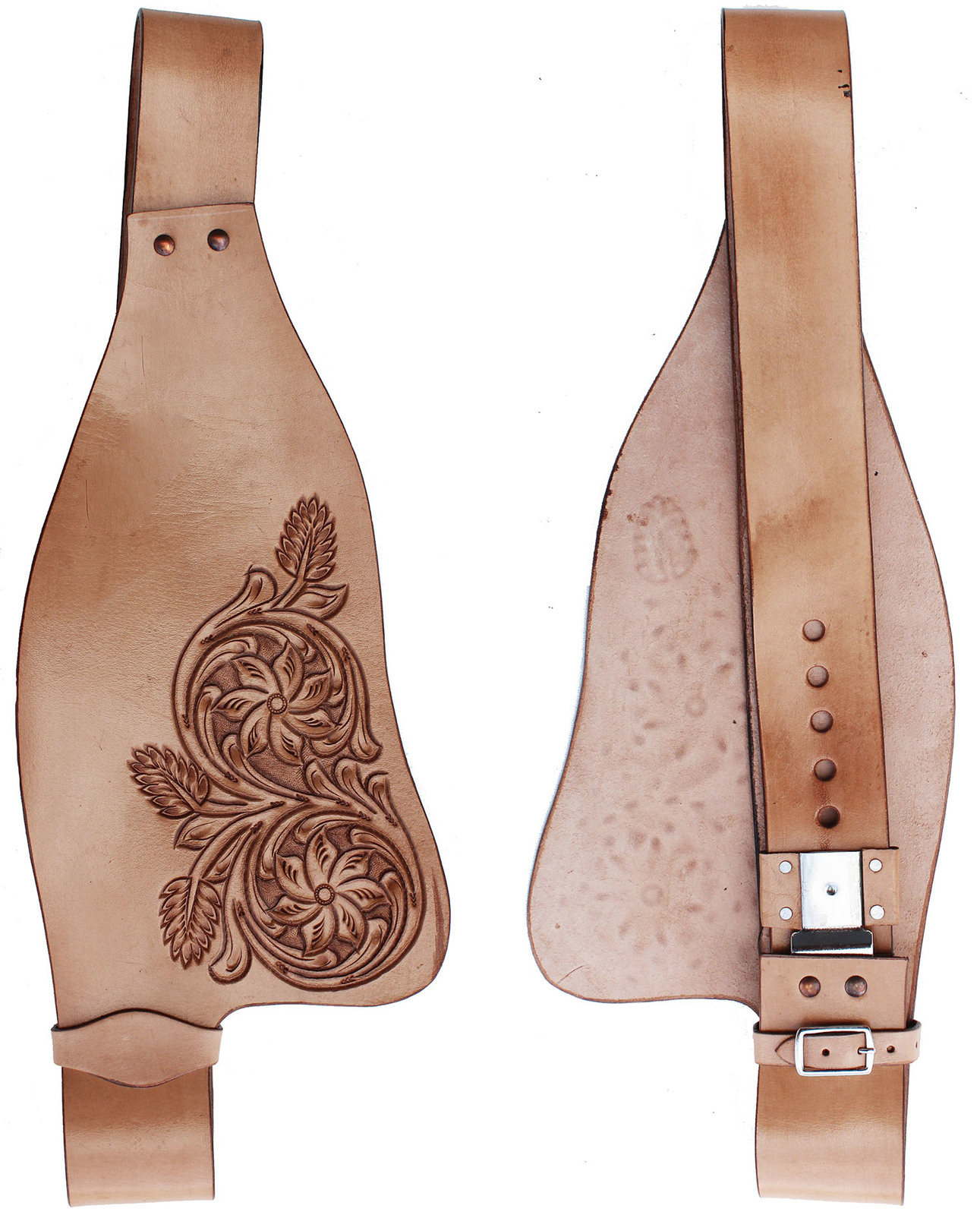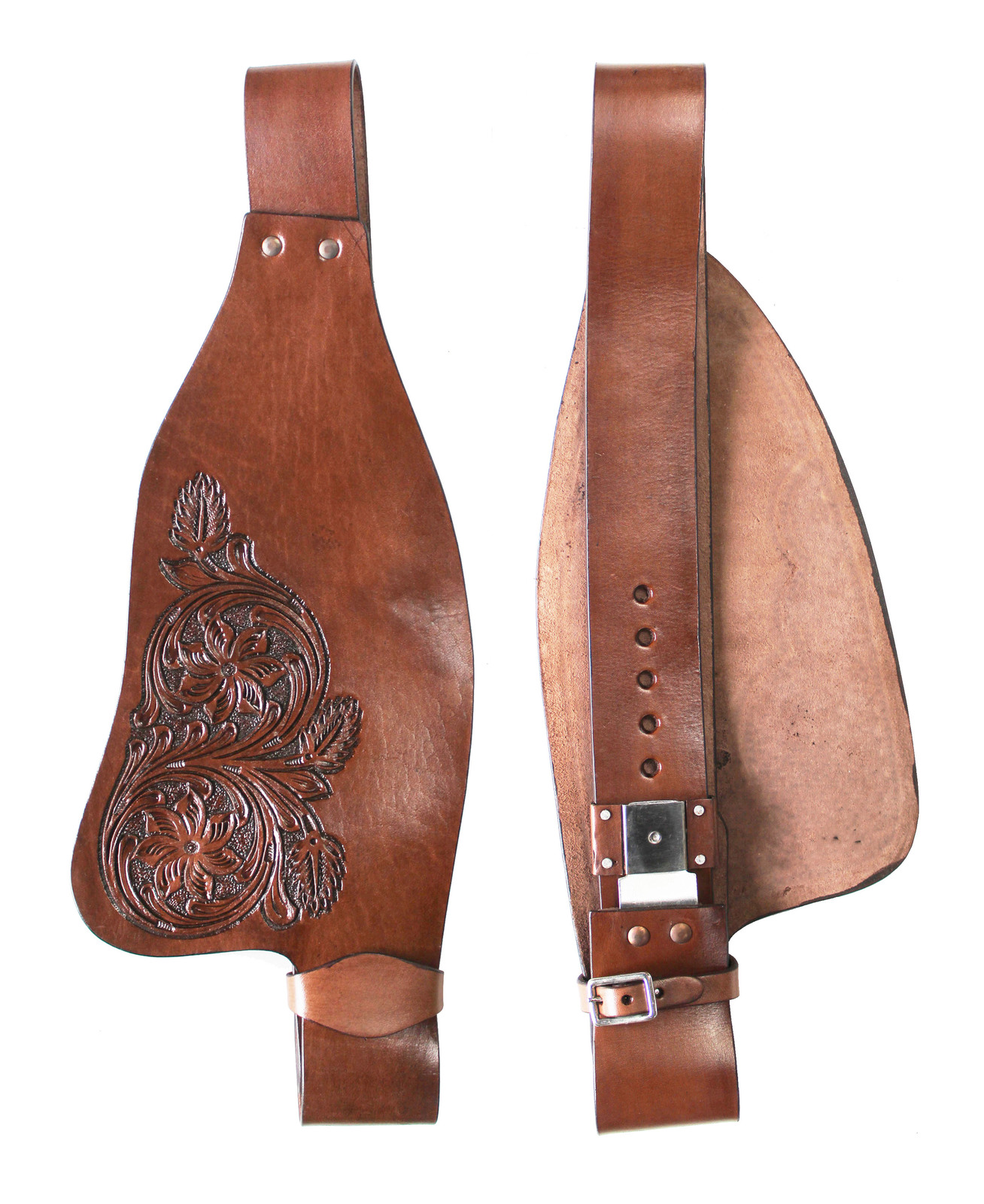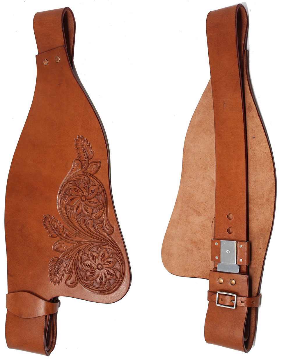 Challenger hand-tooled replacement saddle fenders made of genuine full grain leather. Uniquely accented with floral tooling on light brown finish leather. Fenders come complete with belvins buckles and hobble straps. Adult size, each measure 16-1/4" long x 8-1/4" wide.