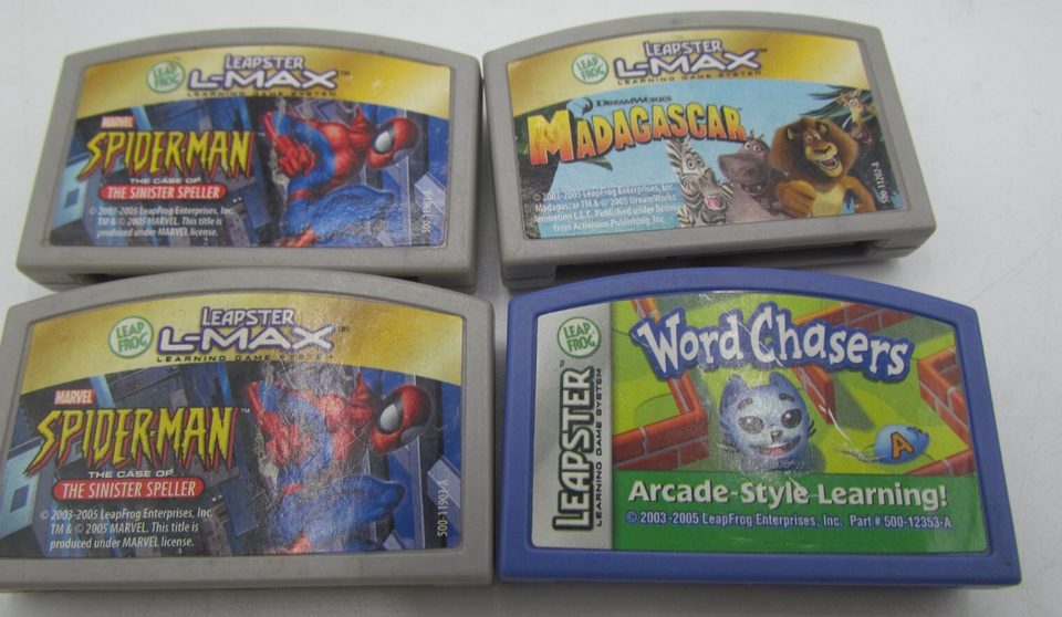 4 LeapFrog LEAPSTER L-MAX Game Cartridge Lot Spider Man Madagascar Word Chasers