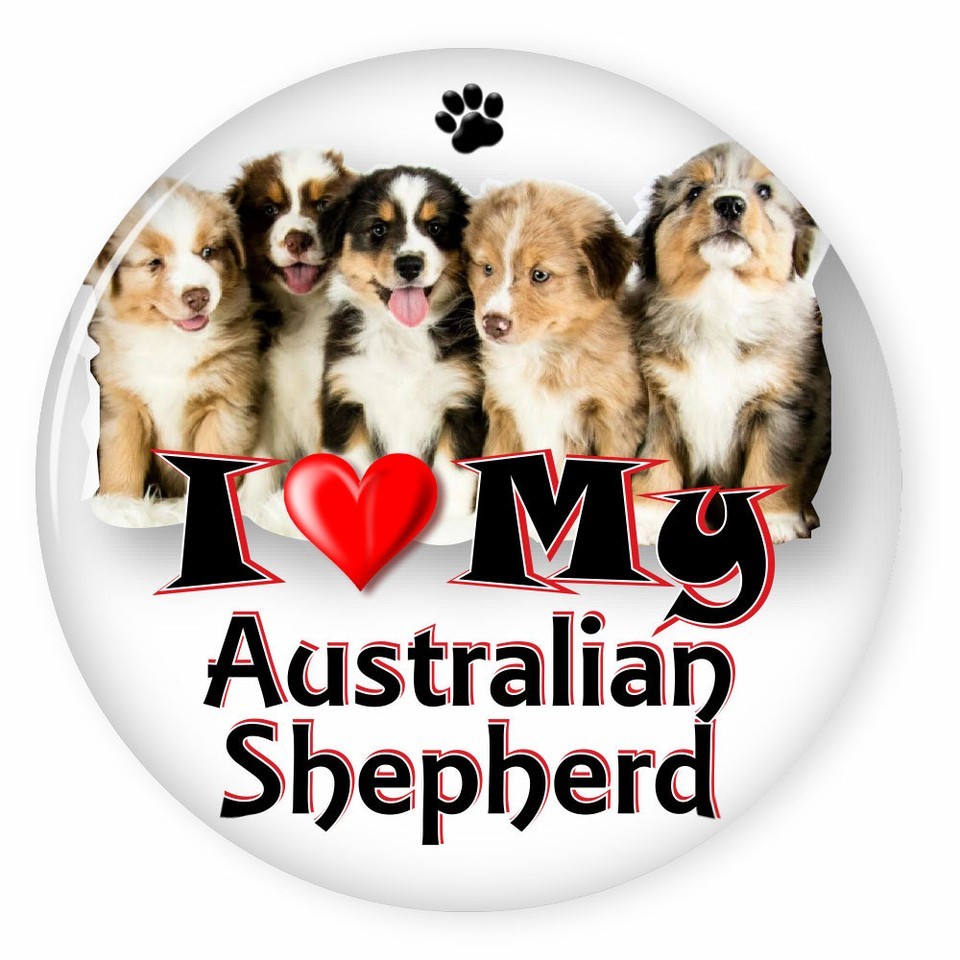 This listing is for QUANTITY 1 - 3" PIN BACK BUTTON. THIS BUTTON READS I (HEART, LOVE) MY AUSTRALIAN SHEPHERD AND FEATURES ADORABLE PUPPIES. YOUR BUTTON WILL SHIP WITHIN 24 HOURS FREE FIRST CLASS MAIL, US ONLY. We also carry a premium econo BLANK name badge line for businesses with high turn over employees (these badges can be personalized with crystal clear labels.)