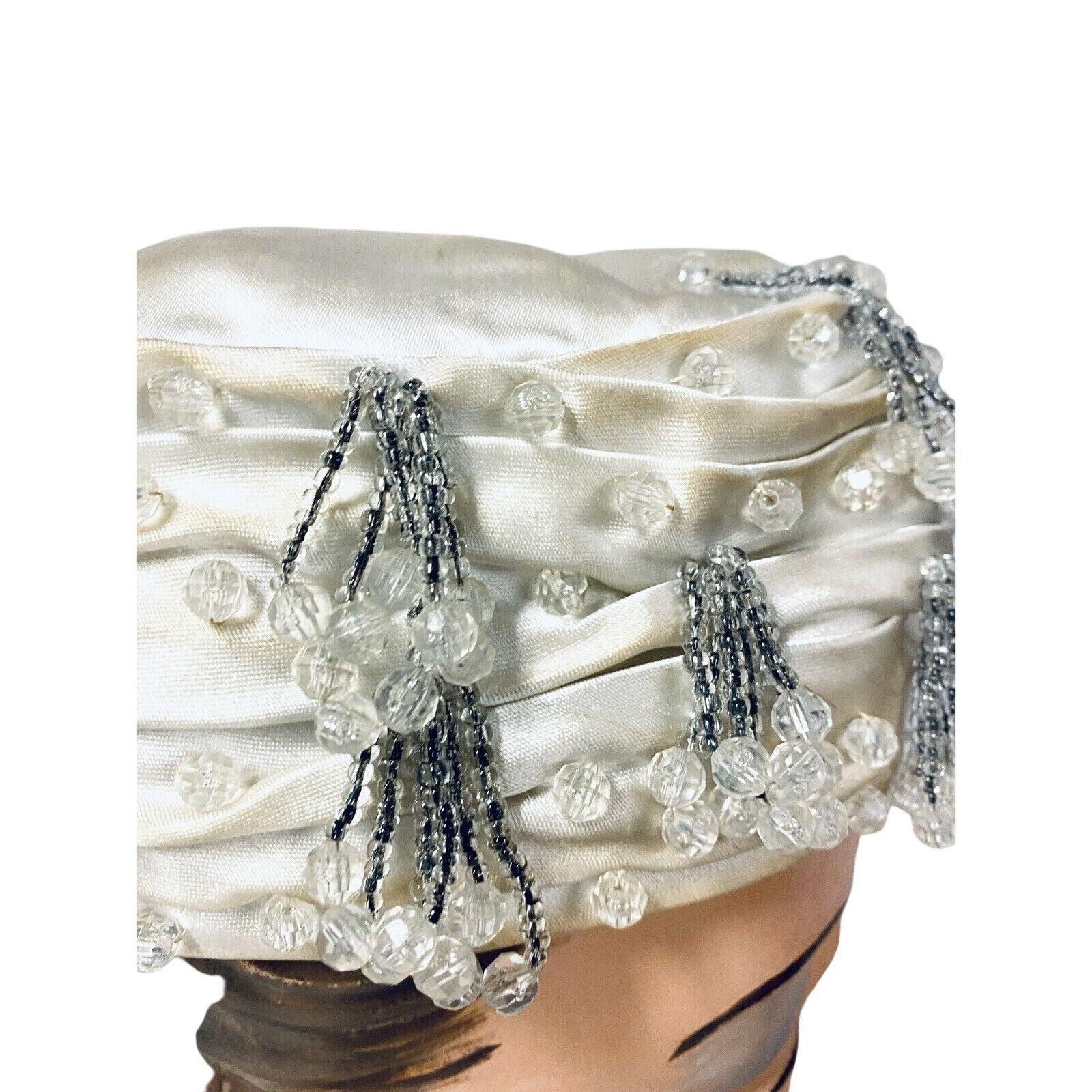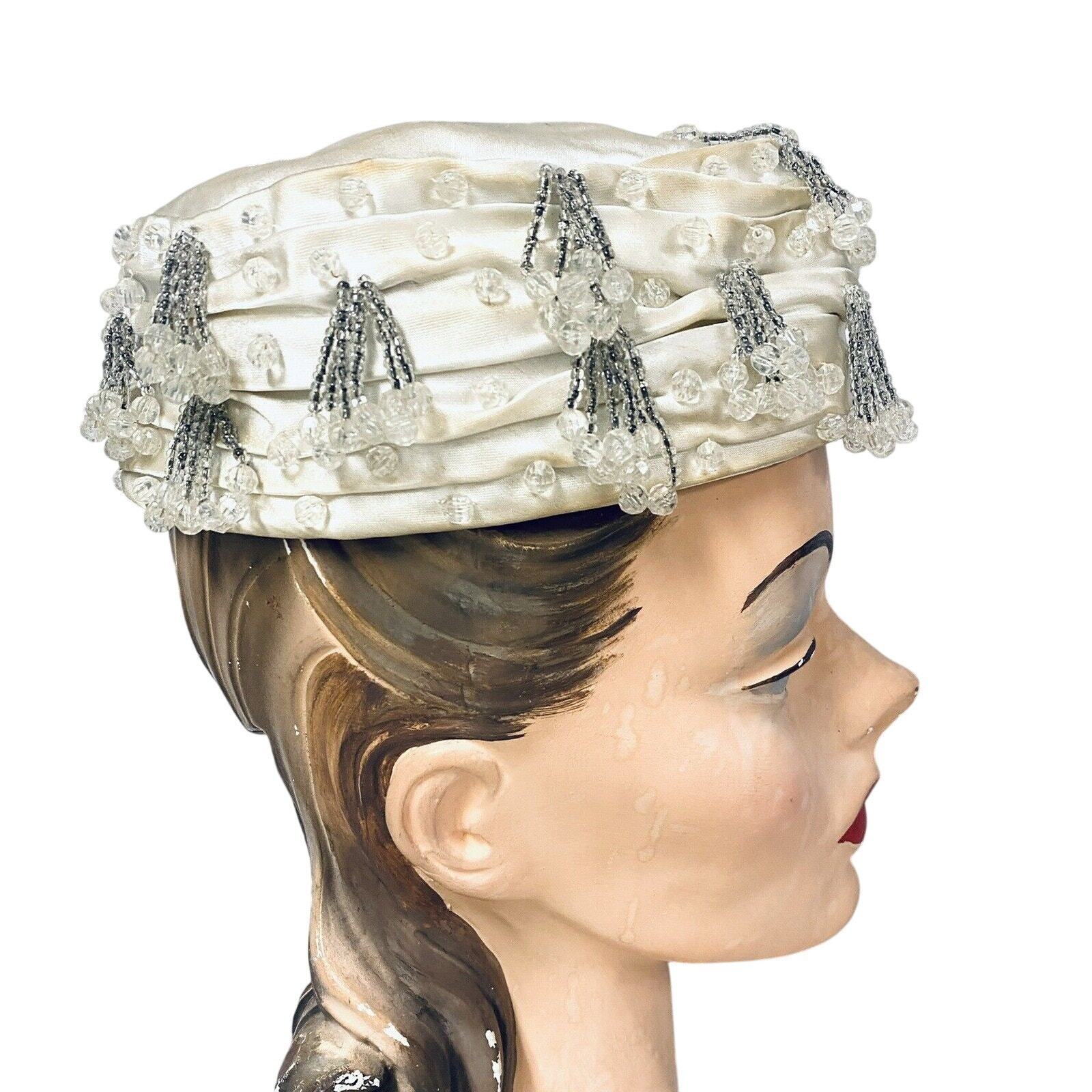 VINTAGE SCHIAPARELLI Hat White Satin Pillbox Crystal Beads Wedding Cocktail 1950