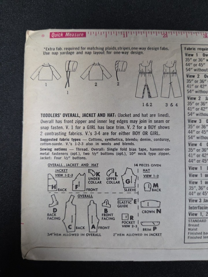 Simplicity Sewing Pattern #5101 Girls 1960s Toddlers Overalls Jacket Hat Sz 1/2