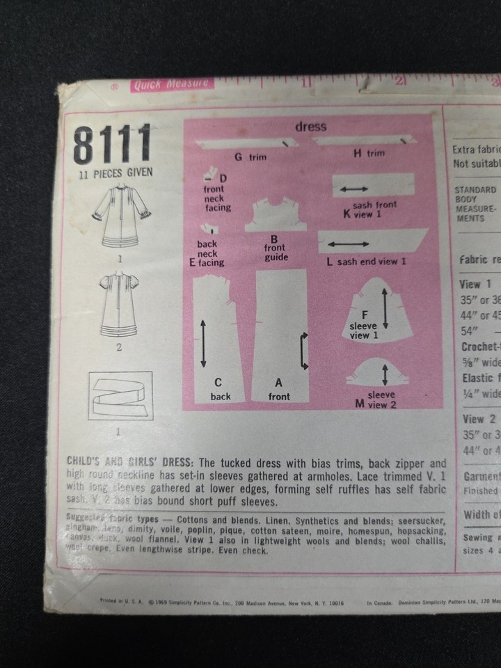 Simplicity Pattern 8111 Chitty Chitty Bang Bang Sz 10 Girls Dresses 1969 Vintage