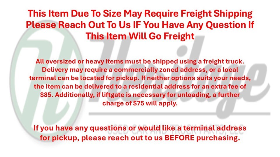 We will not ship freight items and some larger or fragile parts outside of the 48 US states. For large items that must be shipped via Freight Truck (i.e. engines, transmissions, doors, trunks, hoods...etc), the delivery site must be a commercially zoned address capable of unloading a freight truck. There will be an extra charge if you ask for liftgate service.