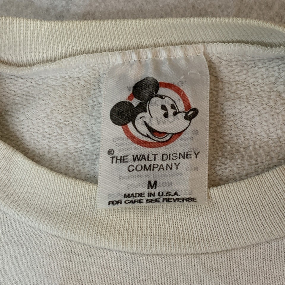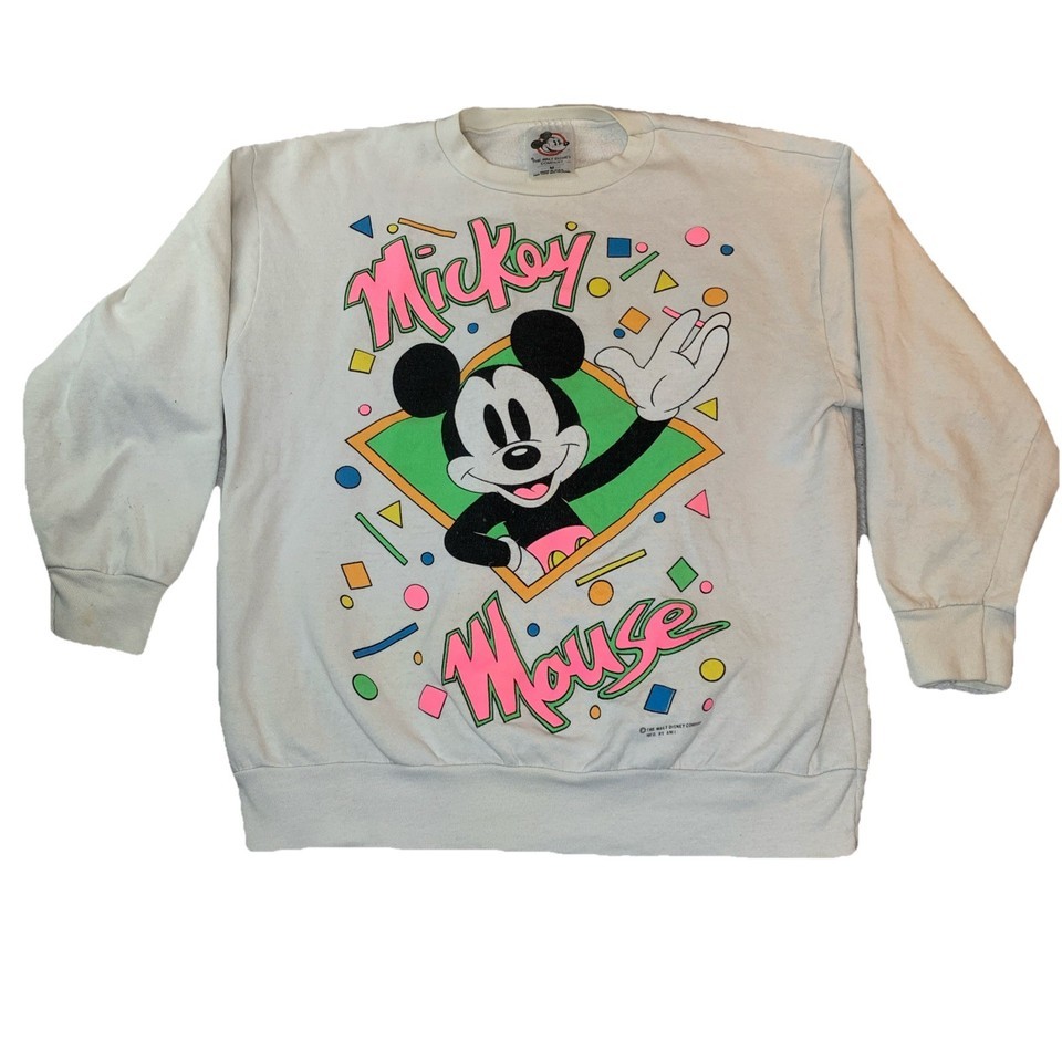 This vintage early 90s Mickey Mouse double graphic crewneck sweater in size medium is a stylish and nostalgic addition to any wardrobe. Featuring a classic Disney character, Mickey Mouse, this white sweater is perfect for casual occasions like travel, parties, or everyday wear. With a crew neck and long sleeves, this pullover sweater is versatile and comfortable, making it a great choice for all seasons. The 80s theme adds a touch of retro flair, while the vintage nature of the piece gives it a unique and timeless appeal. Perfect for fans of Disney and 80s style.