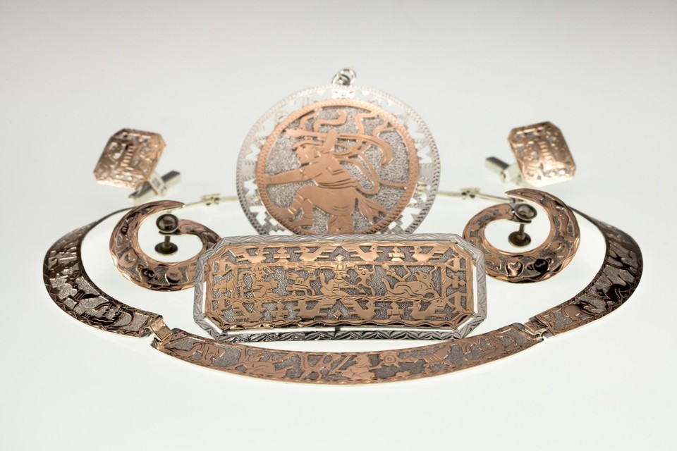 Elemente enthalten: Brosche, Manschettenknopfe, Ohrringe, Halskette und Anhanger