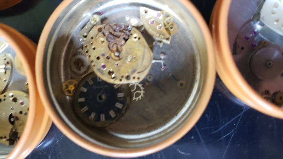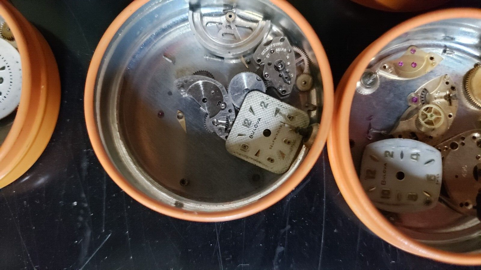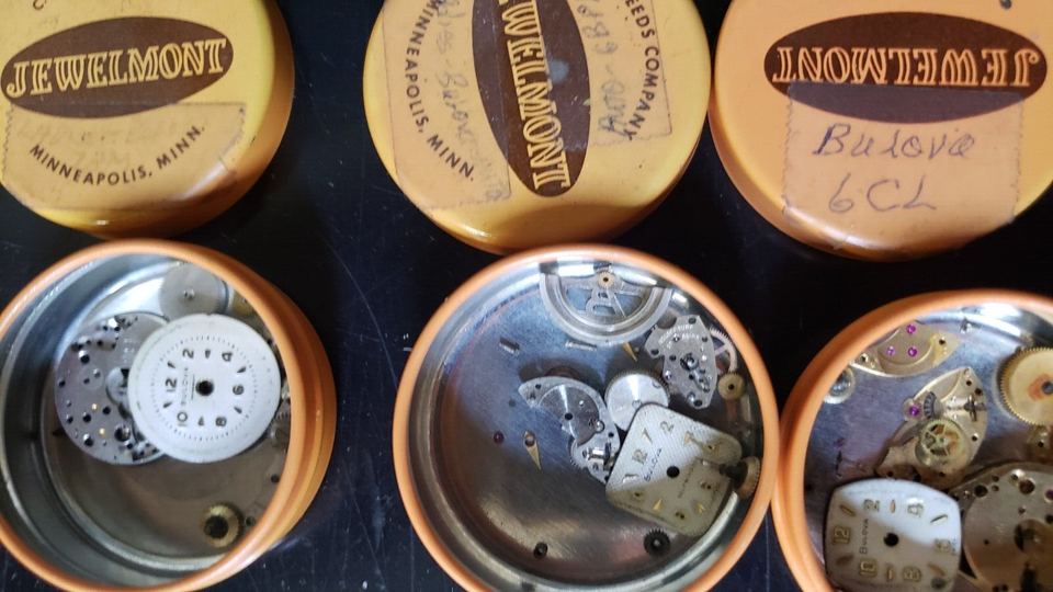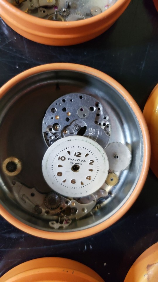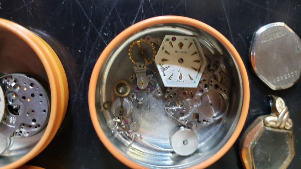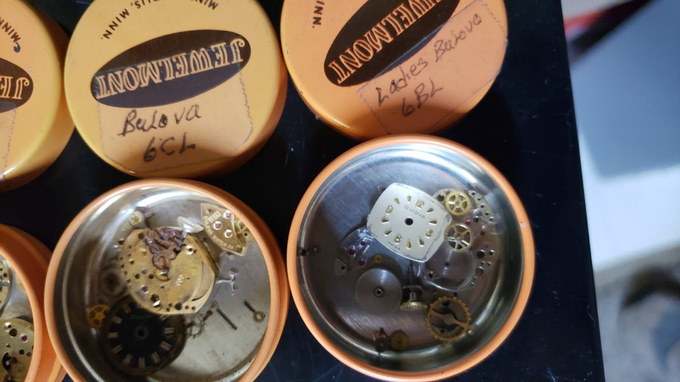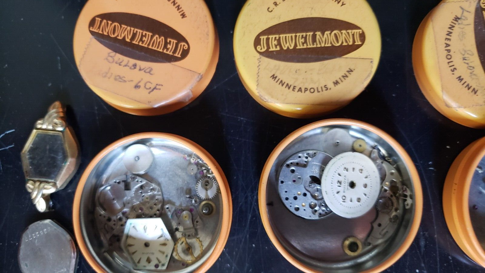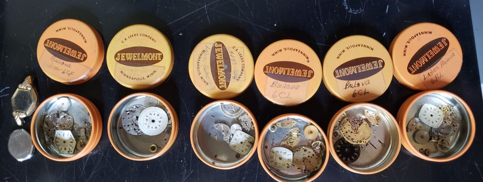 LOT of 6 Vintage 50's 60's Bulova Ladies Watch Movements Dials parts 6bpa 6cl - There 6 are all in groupings together. I assume they match the hand written notes on the tins. I am not 100% sure. But there are 2 of the 6CL, 1 of 6BL, 1 of the 6CF, 1 of the 6BPA and the other is unreadable. They are all Bulova Ladies and all very old! this is a piece of history. If you fix old watches you are in luck. I am not an expert on watches. I bought a big lot of old watch parts from a family watch-repair business that went to auction. They had been in business for 100 years. PLEASE - check out my other vintage watch parts we will be listing more over the next number of months. I will give you a deal if you want multiple orders!! FREE USA SHIP