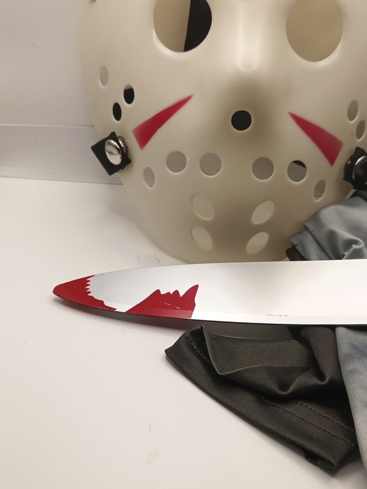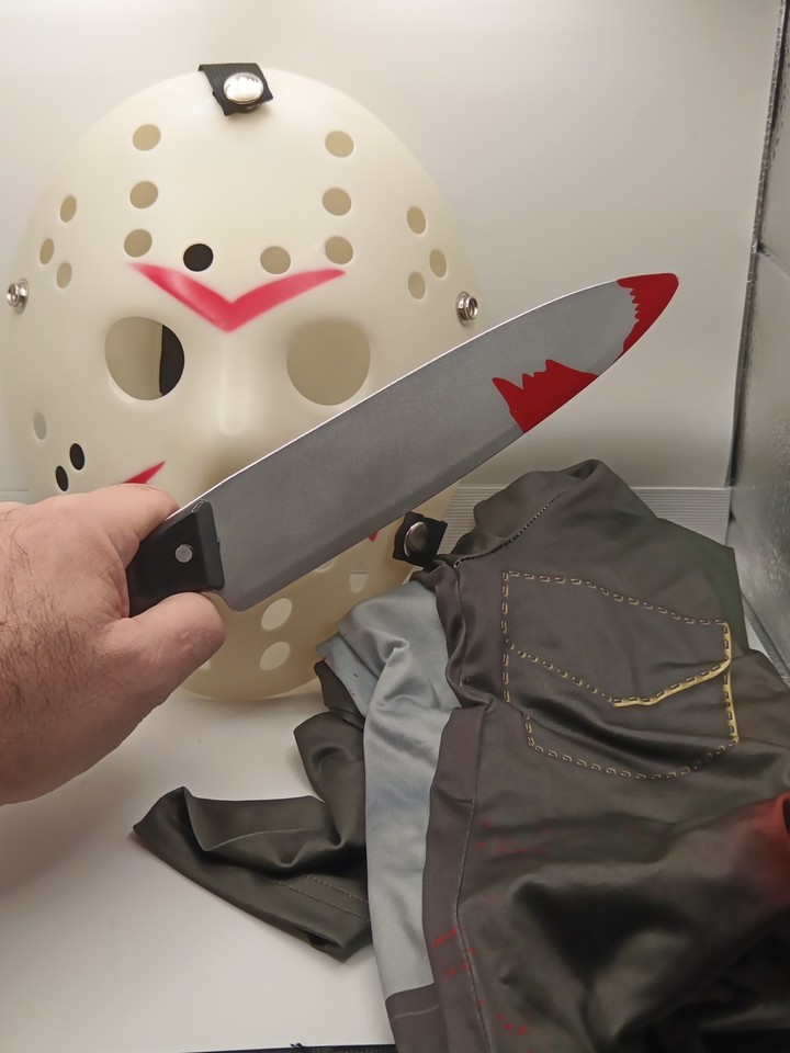 The Jason Mask Costume is a must-have accessory for fans of the iconic Friday the 13th franchise. This Jason Voorhees hockey mask knife combines both style and functionality, perfect for adding a touch of terror to any costume. With its detailed design and high-quality construction, this mask is sure to make a chilling statement at any Halloween party or themed event. The knife is plastic but realistic, it comes with custom cloths for kids, but the mask can be worn by anybody, fast shipping