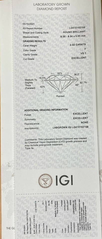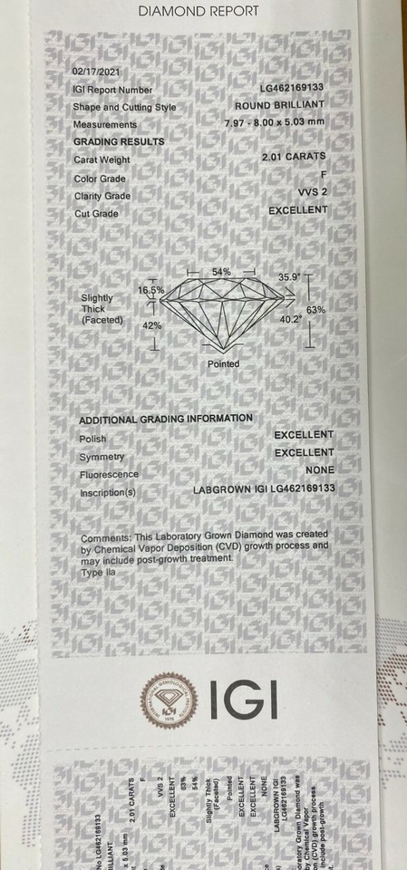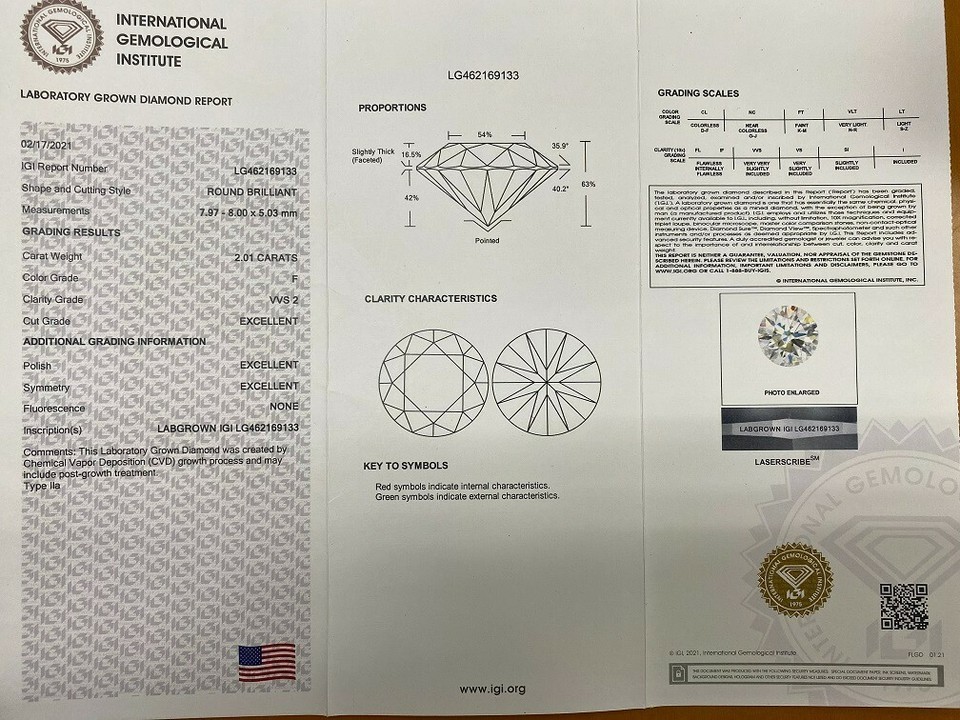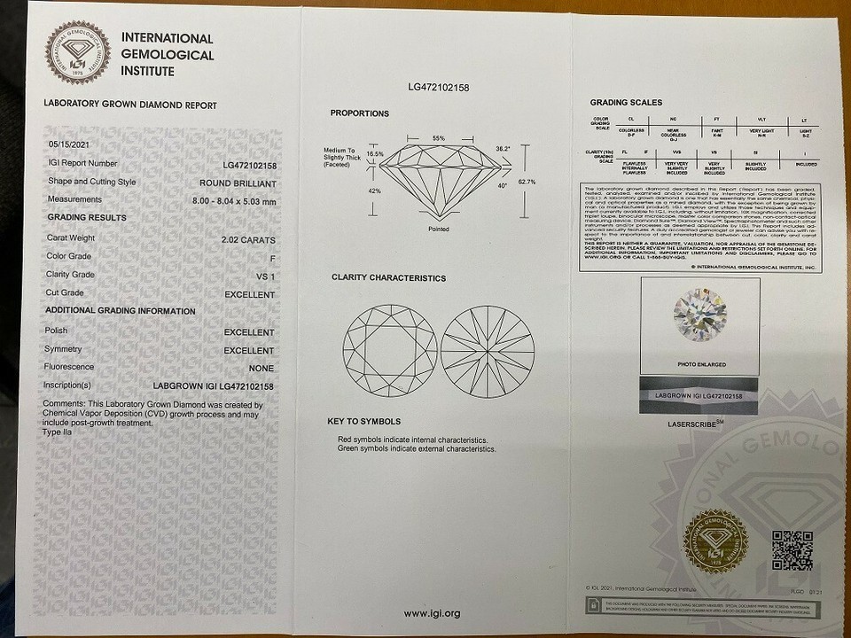 2.01 Karat Cvd Kunstdiamanten Grown Rundschliff Diamant F SI1 Igi Zertifiziert