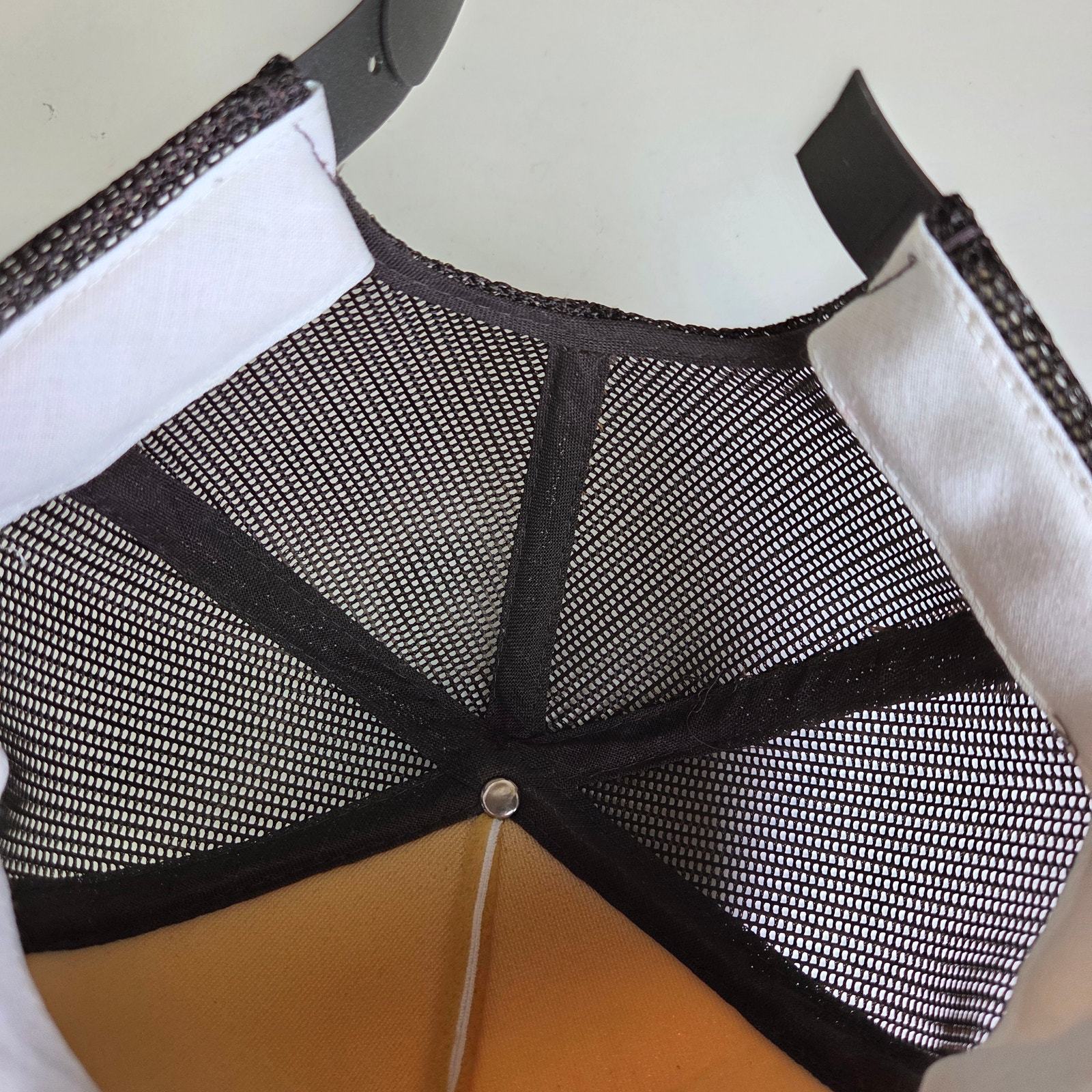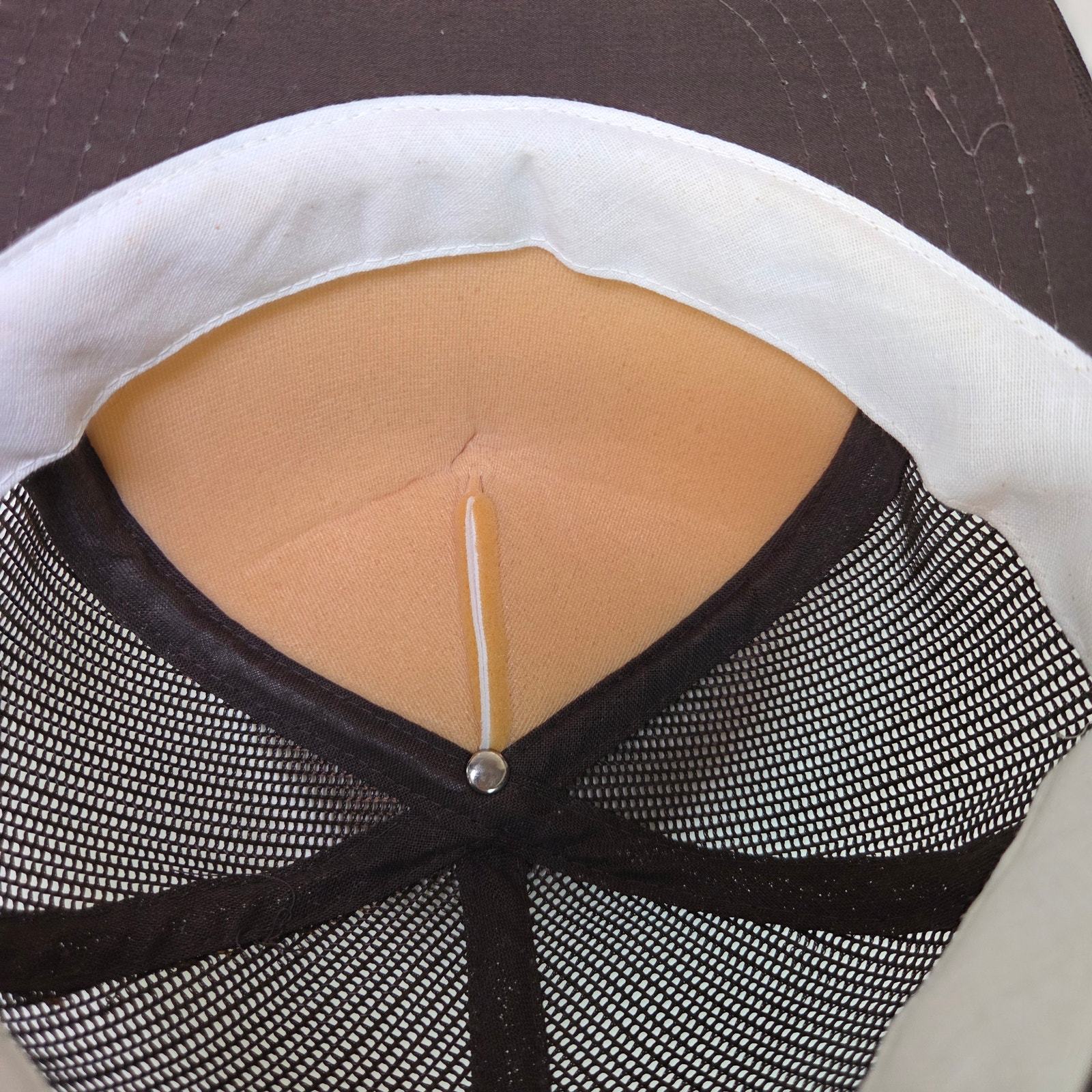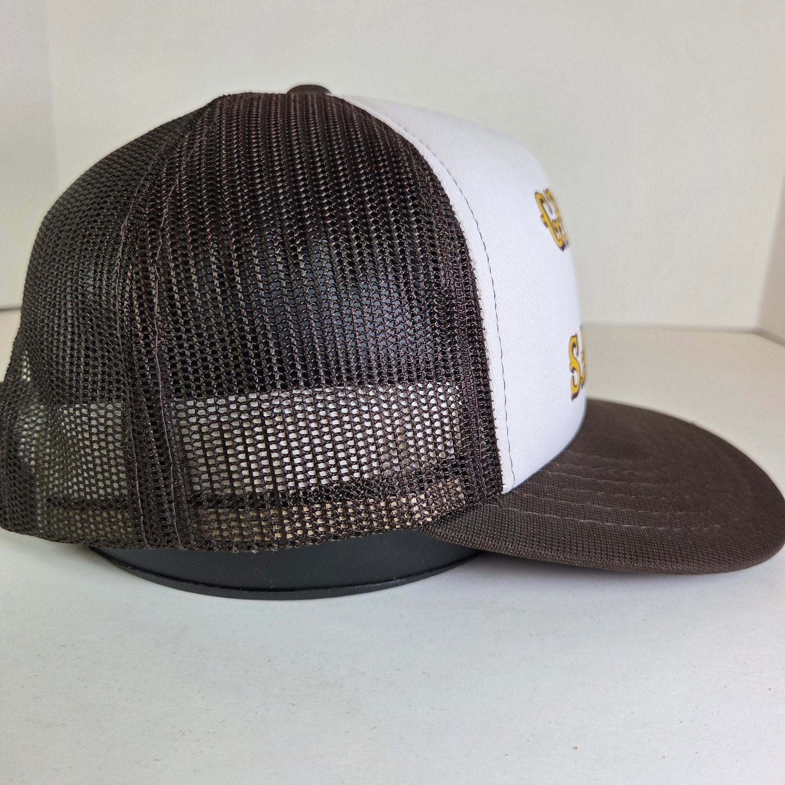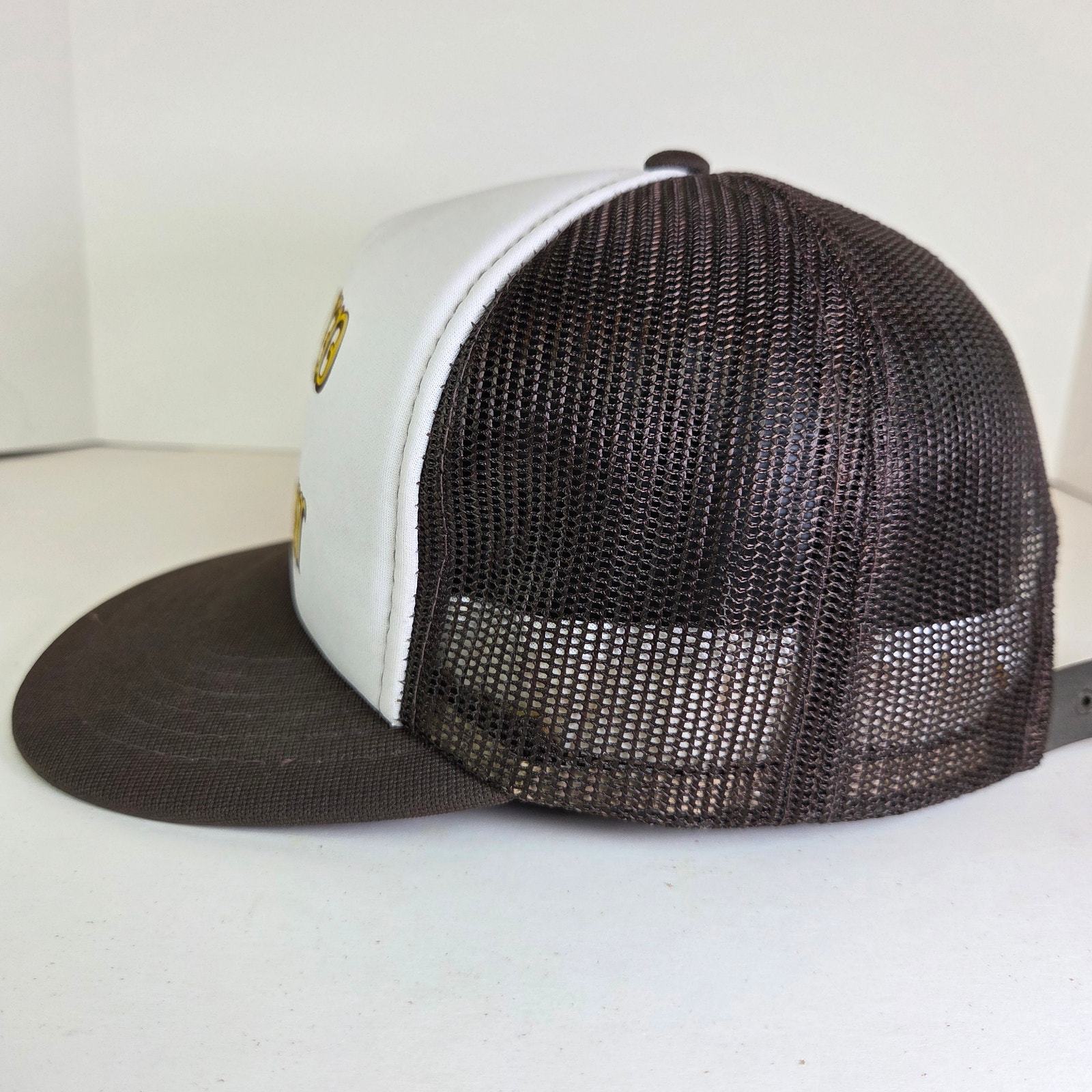 This vintage Grand 7 Saloon trucker hat has a classic foam front with bold yellow lettering and a breathable mesh back. The brown and white color combo makes it a standout retro accessory. Please note: the snapback strap is broken (see photos). This cap is best suited as a collector?s item, display piece, or for someone who restores vintage hats. The foam front panel remains intact and the graphic is clean, making it a great candidate for preservation or repurposing.