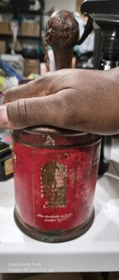 Classic tobacciana tin with raised/domed lid. Displays well but shows notable wear: surface rust, paint loss, and label loss (see photos). Lid present.