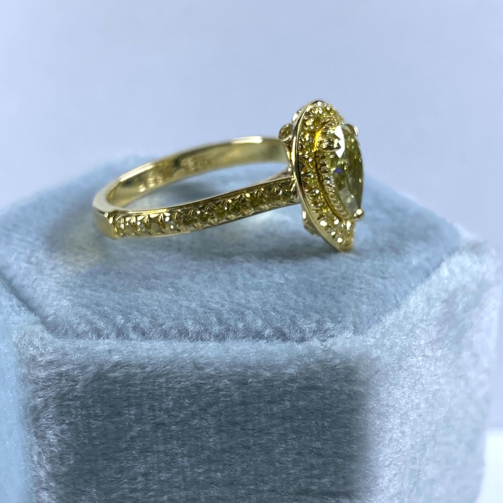 This diamond engagement ring showcases a 1-carat GIA certified fancy yellow pear-shaped diamond, encircled by a halo of round-cut yellow diamonds. The entire ensemble is beautifully set in an 18k yellow gold setting, adding a touch of luxury to the exquisite design.