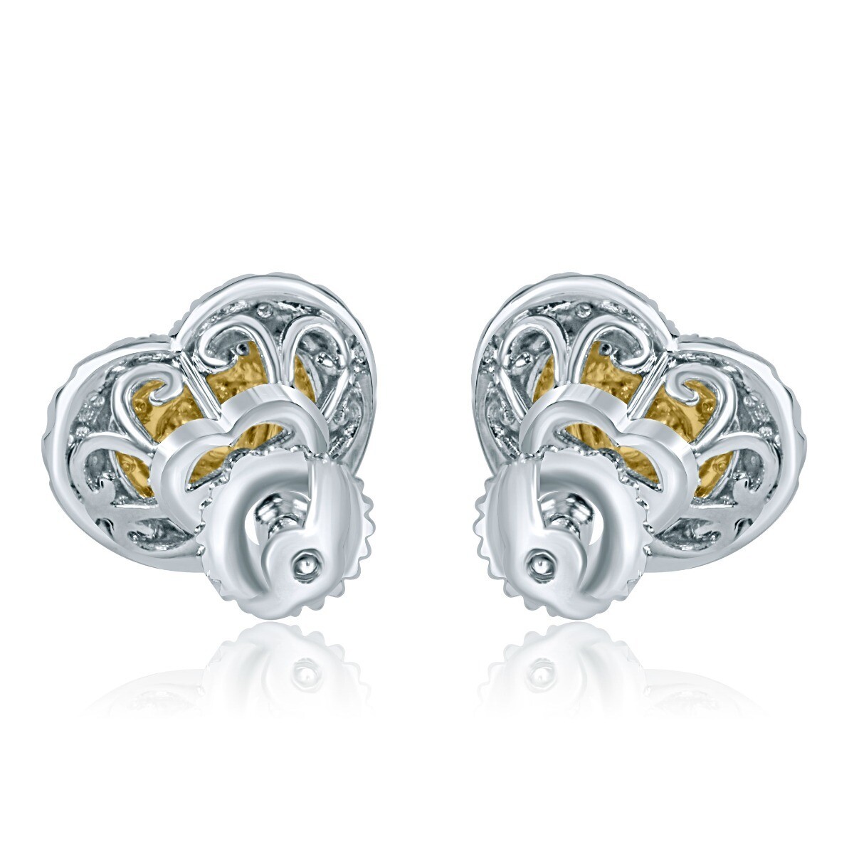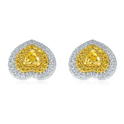 Diese schonen Holzerohrringe verleihen dem besonderen Moment Magie! Diese Ohrringe verfügen über 1,04 Karat Herz natürliche schicke, hellgelbe Diamant -Mittelsteine, die von einem doppelten Halo aus gelben und farblosen runden brillanten Diamanten in Mikro -Pave -Umgebung umgeben sind. Handgefertigt in 14k zwei Tongold. Die Ohrringe sichern mit Schraubenrückverschluss.