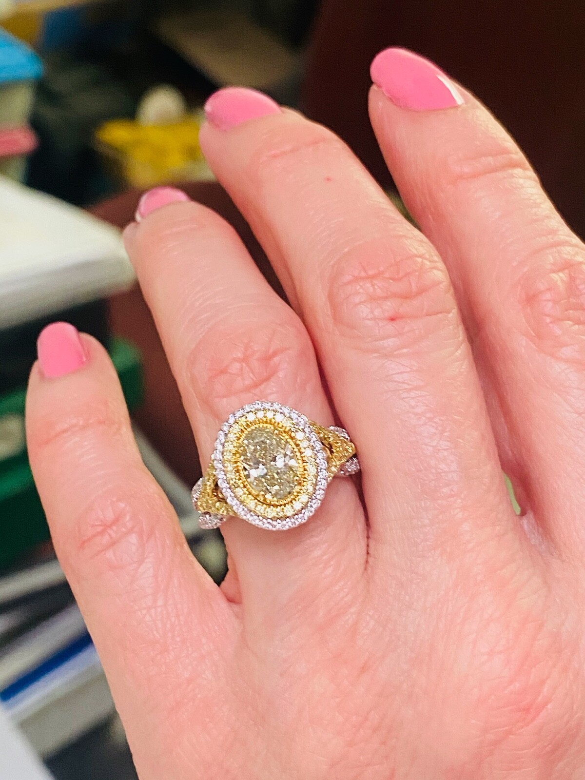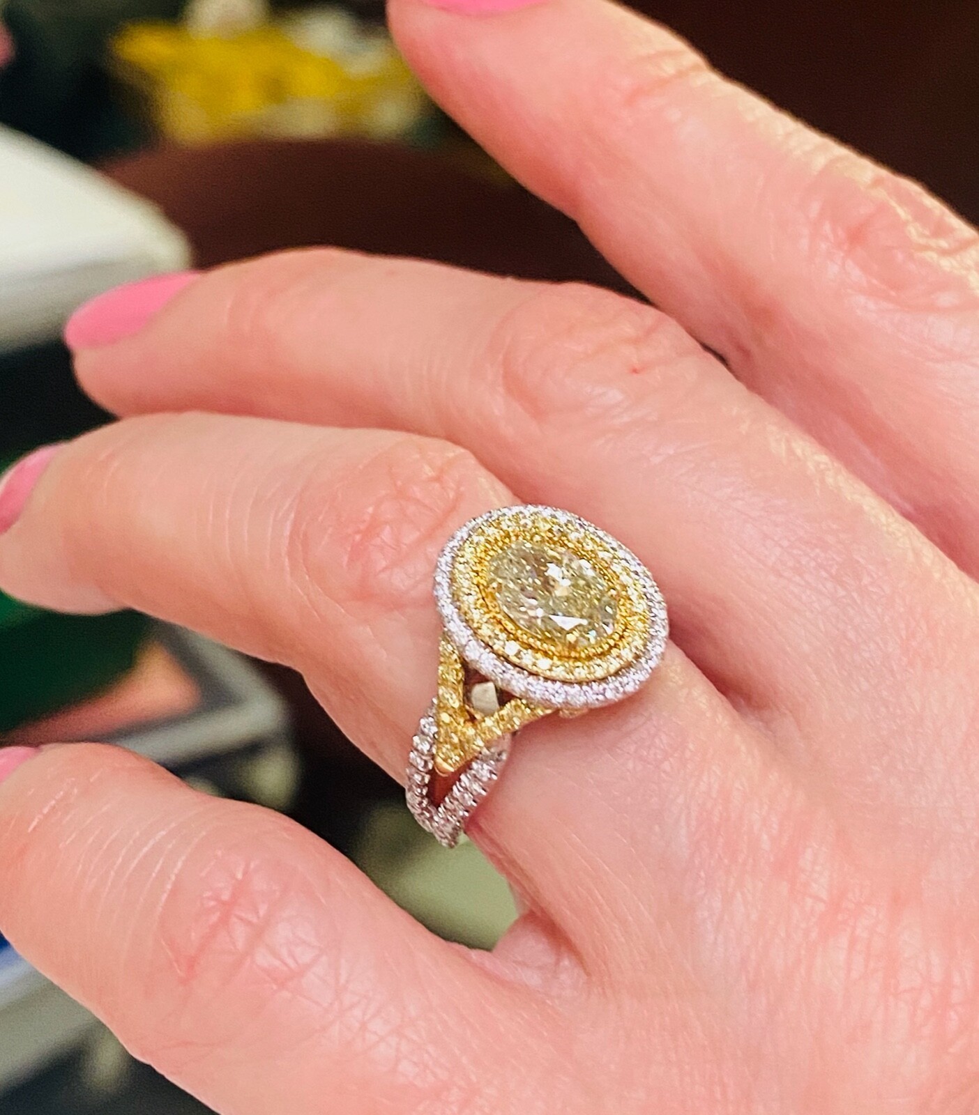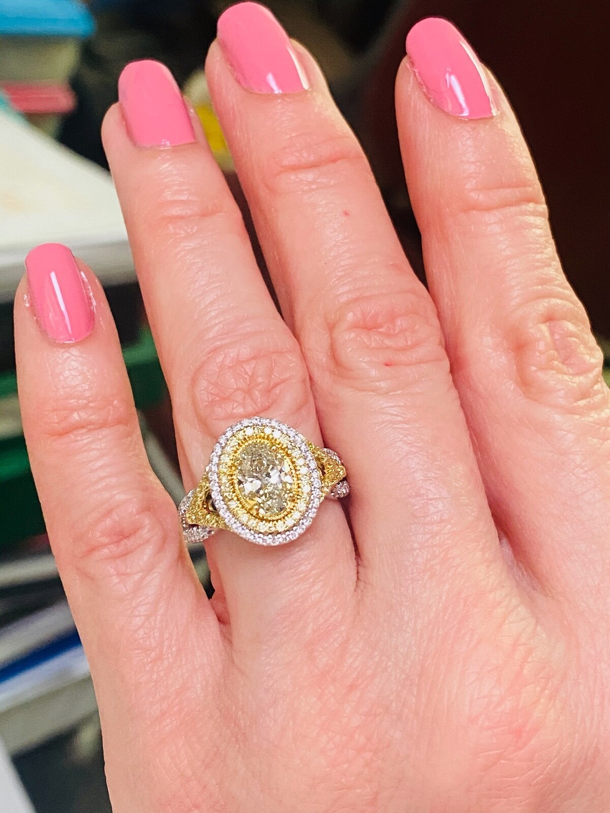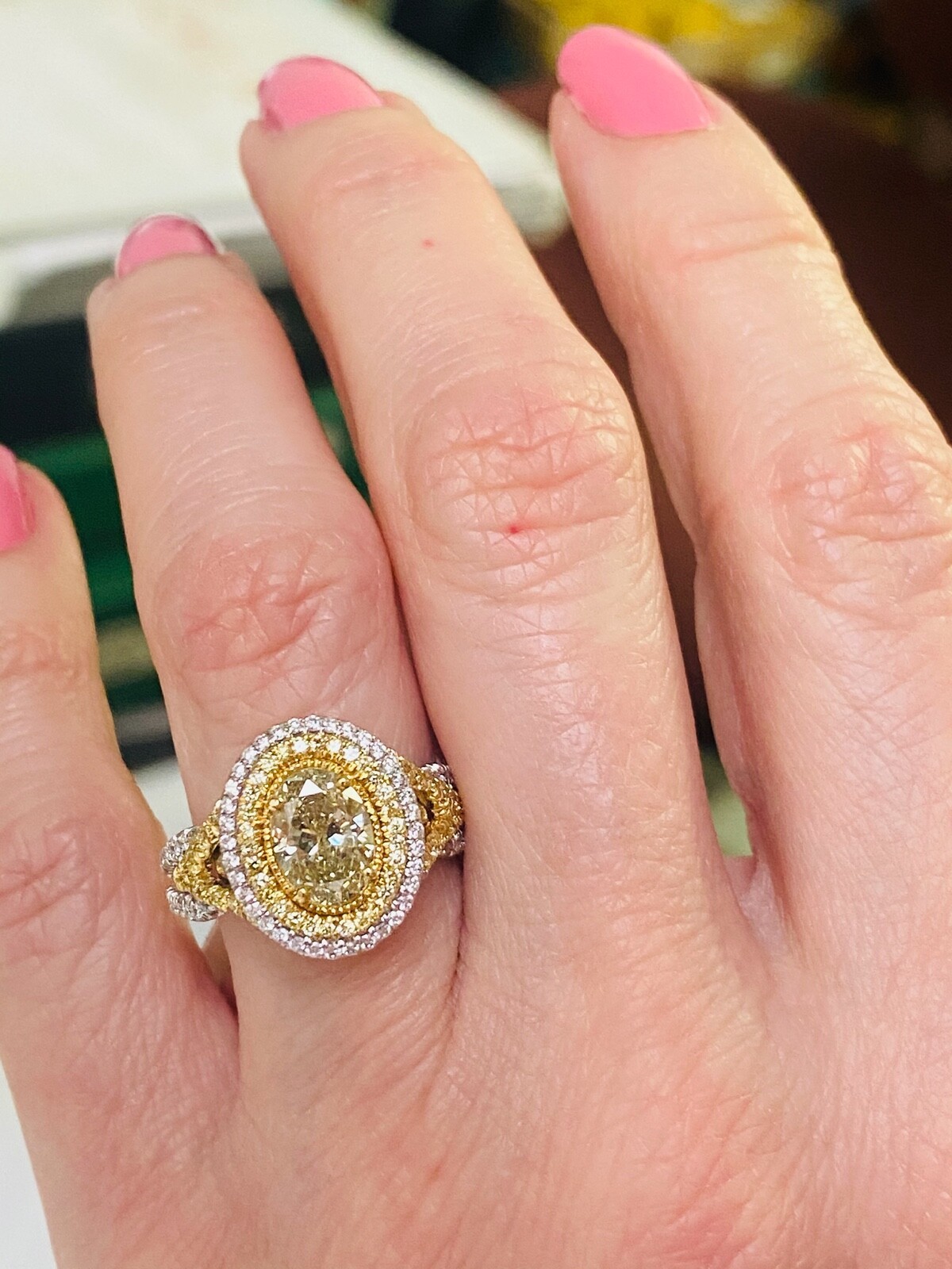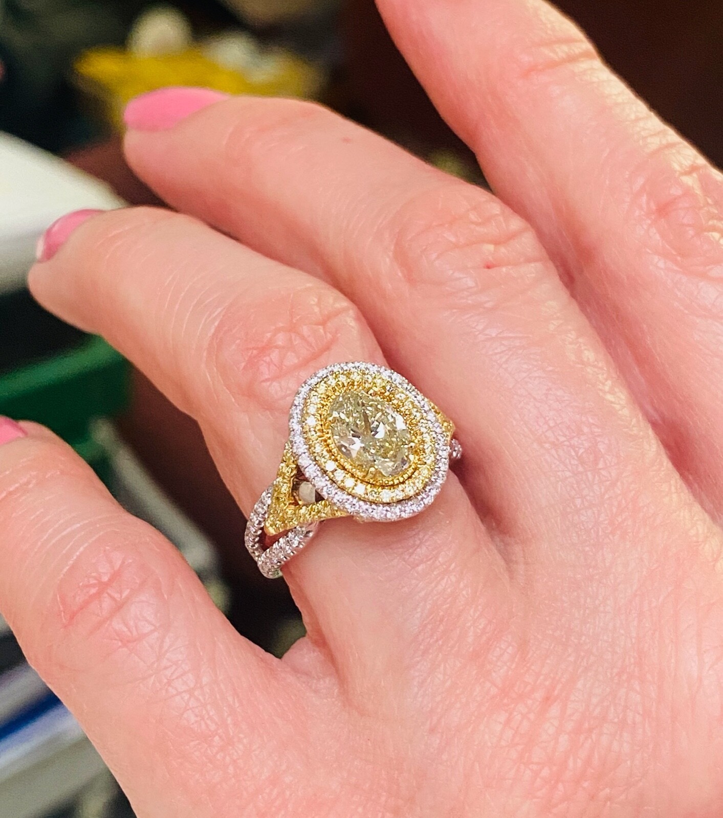 La bague de fiancailles exquise dispose d'un diamant coupe ovale jaune vert de 1,00 carat GIA dans un double halo de diamants incolores et jaunes scintillants. La couleur du diamant central change temporairement lorsqu'elle est doucement chauffee ou lorsqu'elle est laissee dans l'obscurite pendant une periode et est connue sous le nom de "cameleon". Des diamants supplementaires tapissent la tige divisee moderne ajoutant un sparkle supplementaire a l'anneau. Fabrique a la main en or multi-ton de 18 karats. Le poids total des carats est de 1,76 carats.