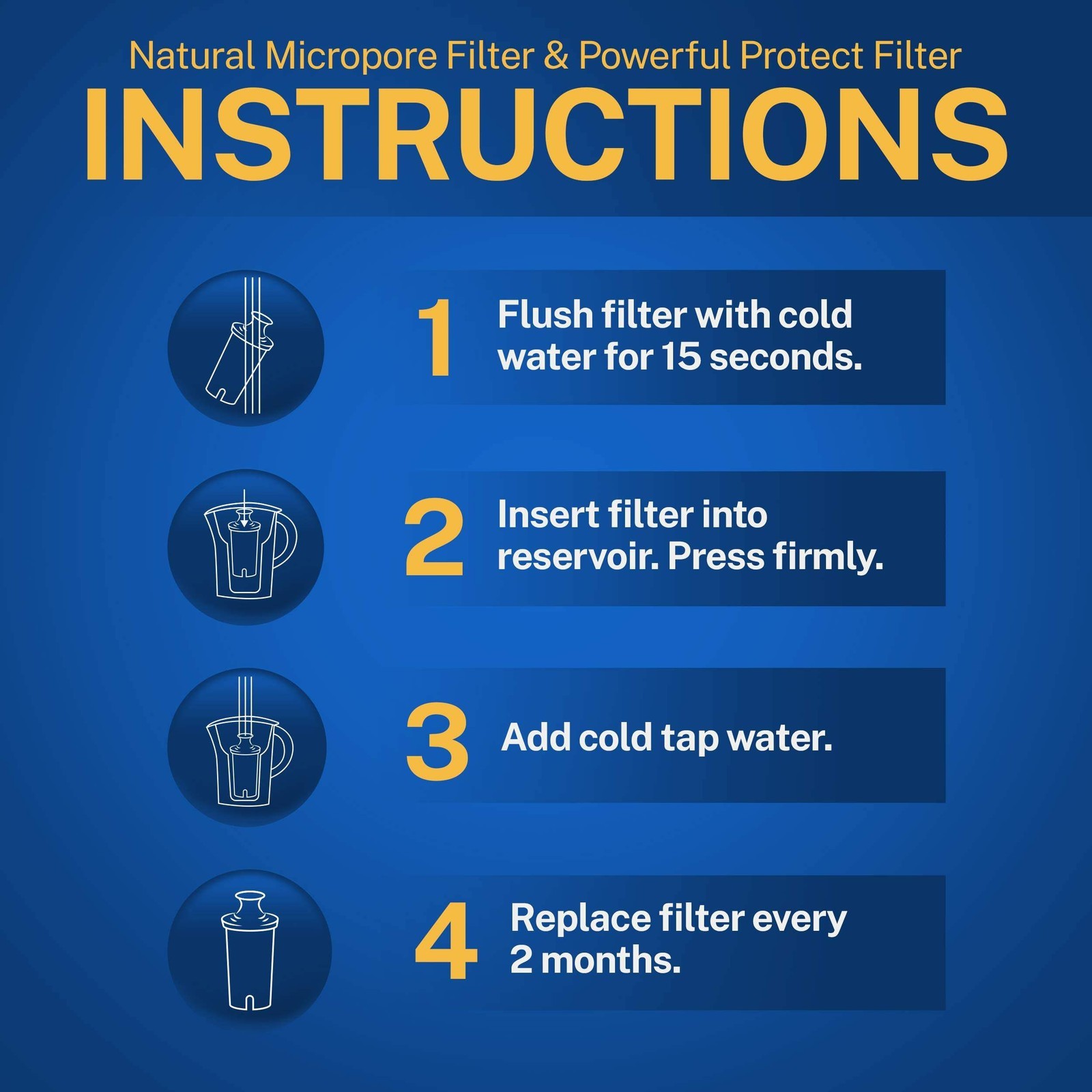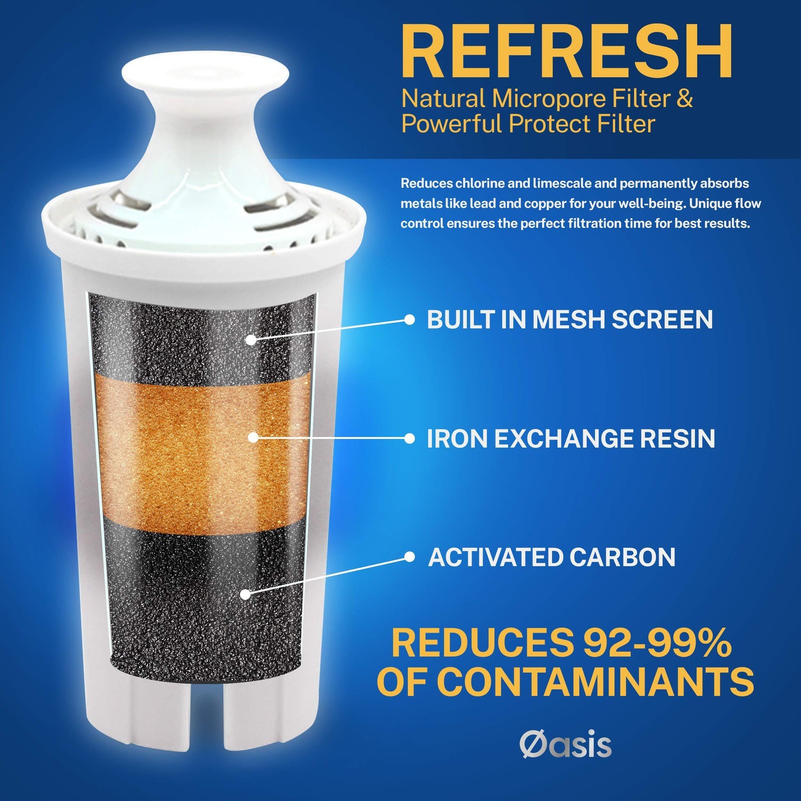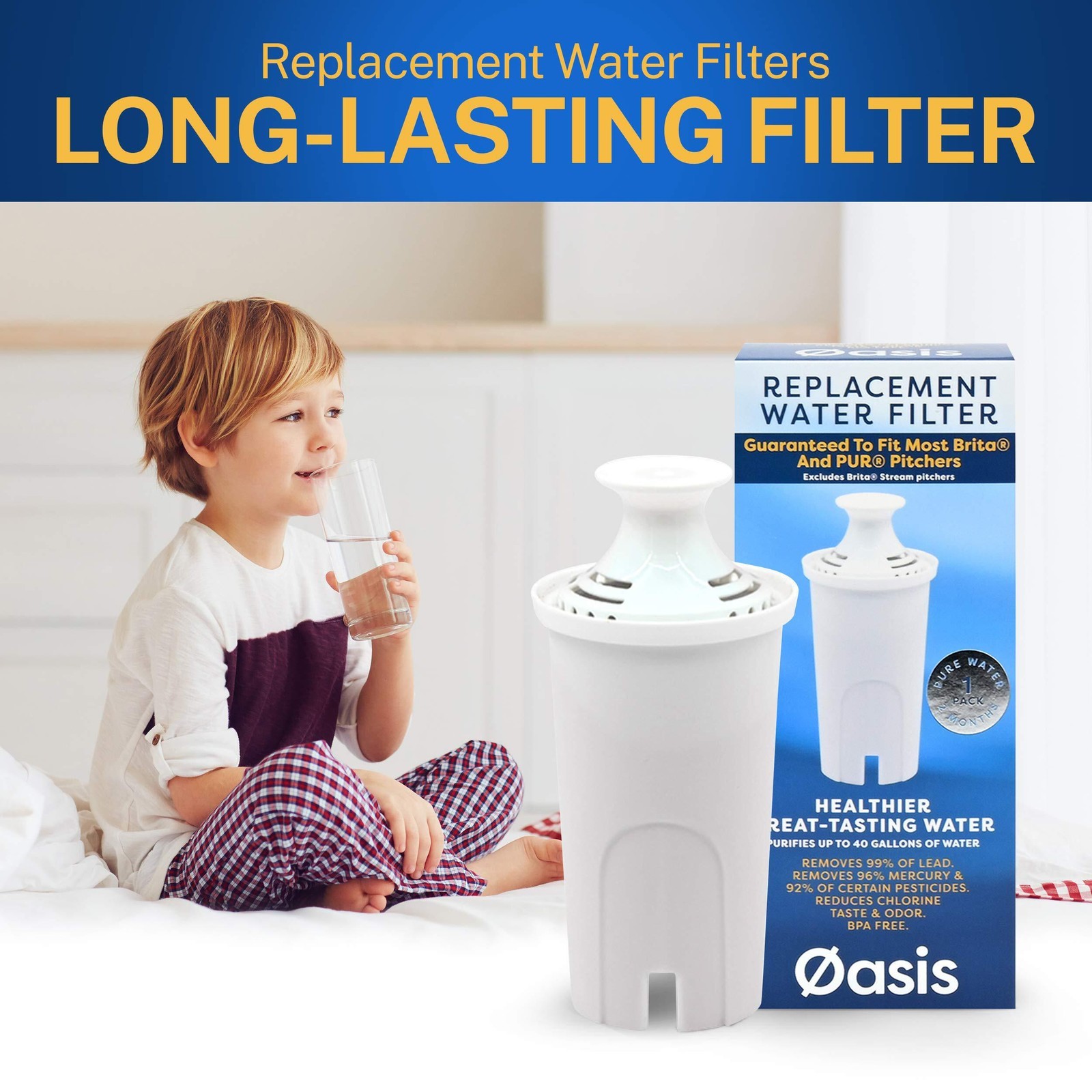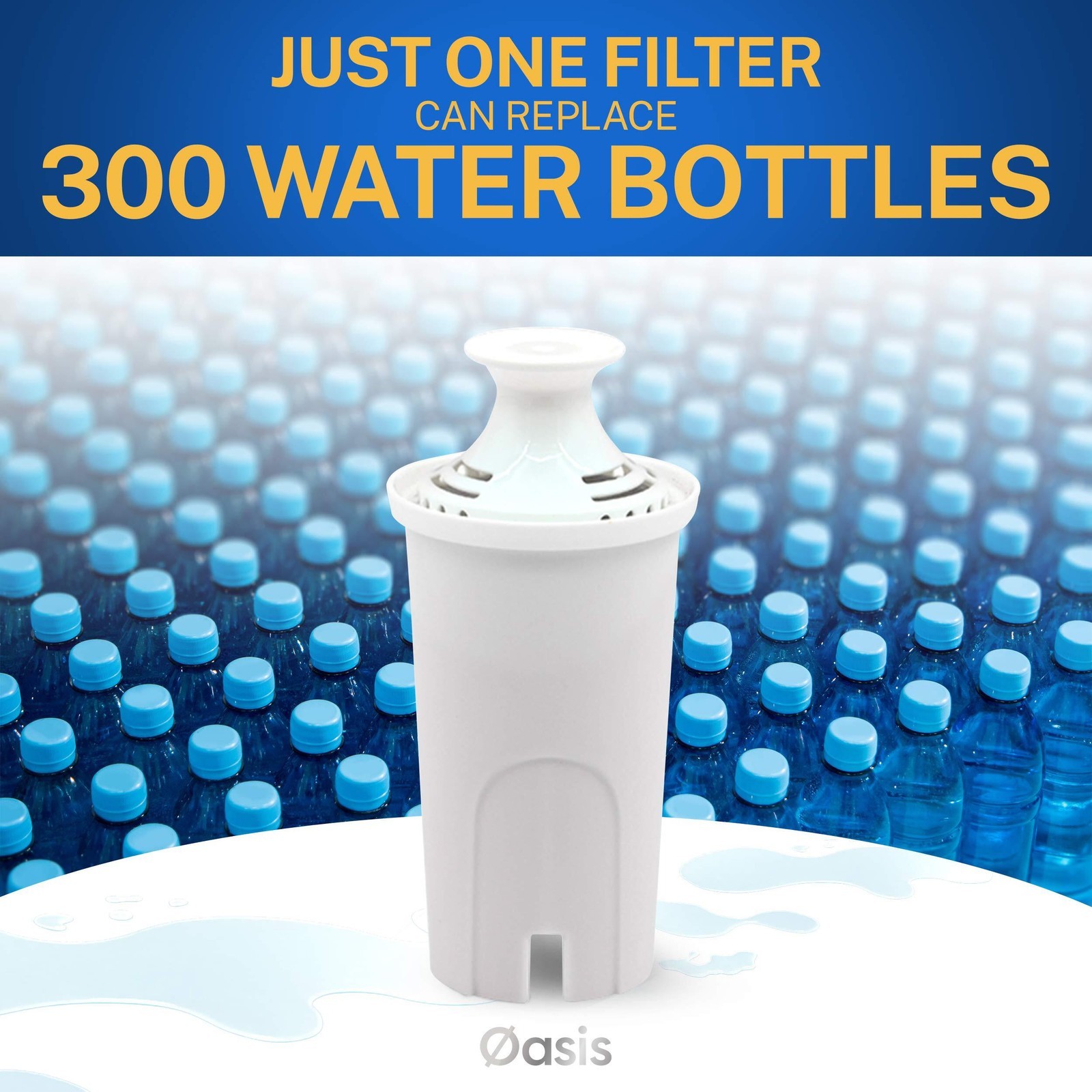 ? Clean Water: Our premium water purifier water will be delicious, which reduces the odor and chlorine so that you may drink, cook coffee or tea with crisp, pleasant, clear water and no unwanted particles blocked with our fine mesh filters ? Protect Your Family: Oasis reduce our premium free BPA, all-natural gravity system which was tested and certified by WAO according to NSF/ASNI standard 4, copper, mercury, zinc, cadmium and other dangerous substances ? Easy to Install: Sprinkle your commercial cool filter with water for 15 minutes and then rinse for 30 seconds, put the filter in a pitcher storage tank, push down to ensure safety, add cold tap water ? Easy to Install: You can easily install our premium water filter pitcher in your dispenser; Brita Classic, Monterey, Pacifica, Atlantis, Bella, Soho, Every-day, Grand, Marina, PUR, easy to carry where ever you want ? 300 Bottles: because of durable and long-lasting premium water pitcher you can easily fill more than 300 bottles from 1 filter because it reduces 92-99% contaminants and remain same taste from 1st to last bottle