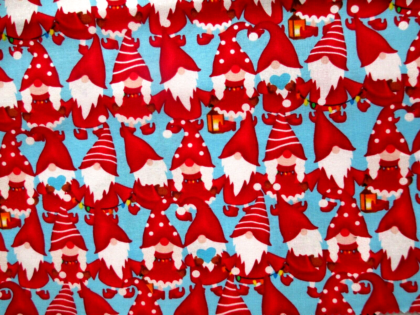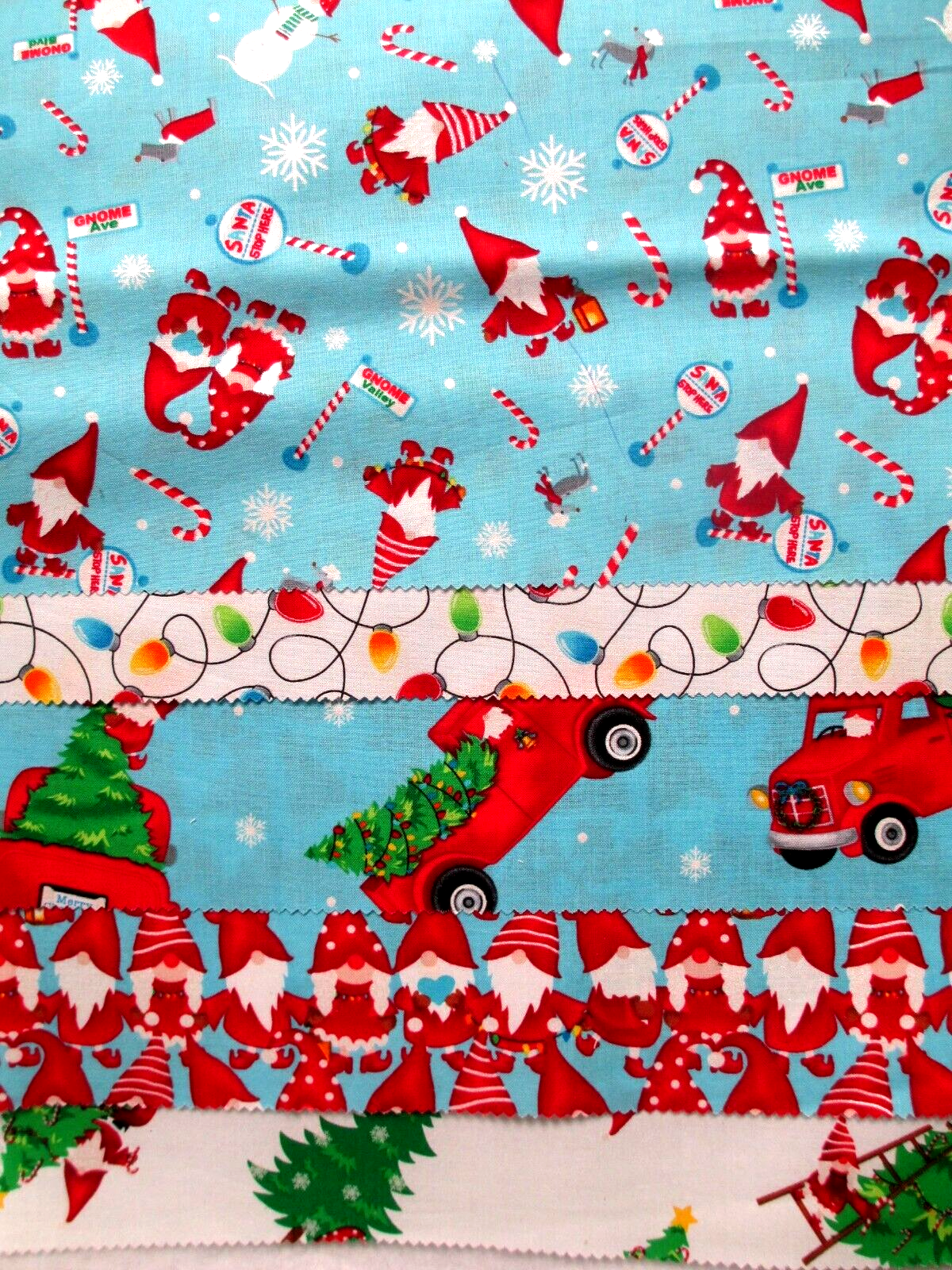 This fabric listing is by Red Rooster centering around Gnomes decorating for Christmas. There are 5 sample pieces only so please take note of their dimensions below: