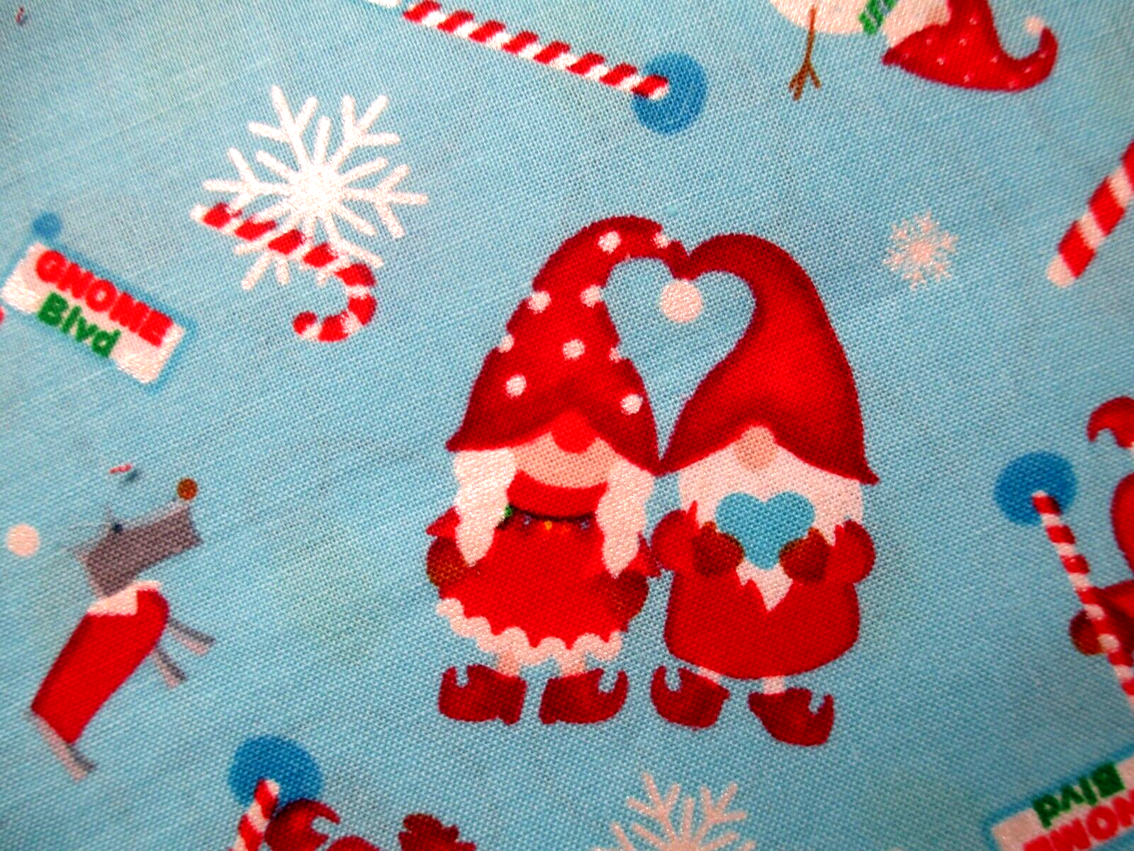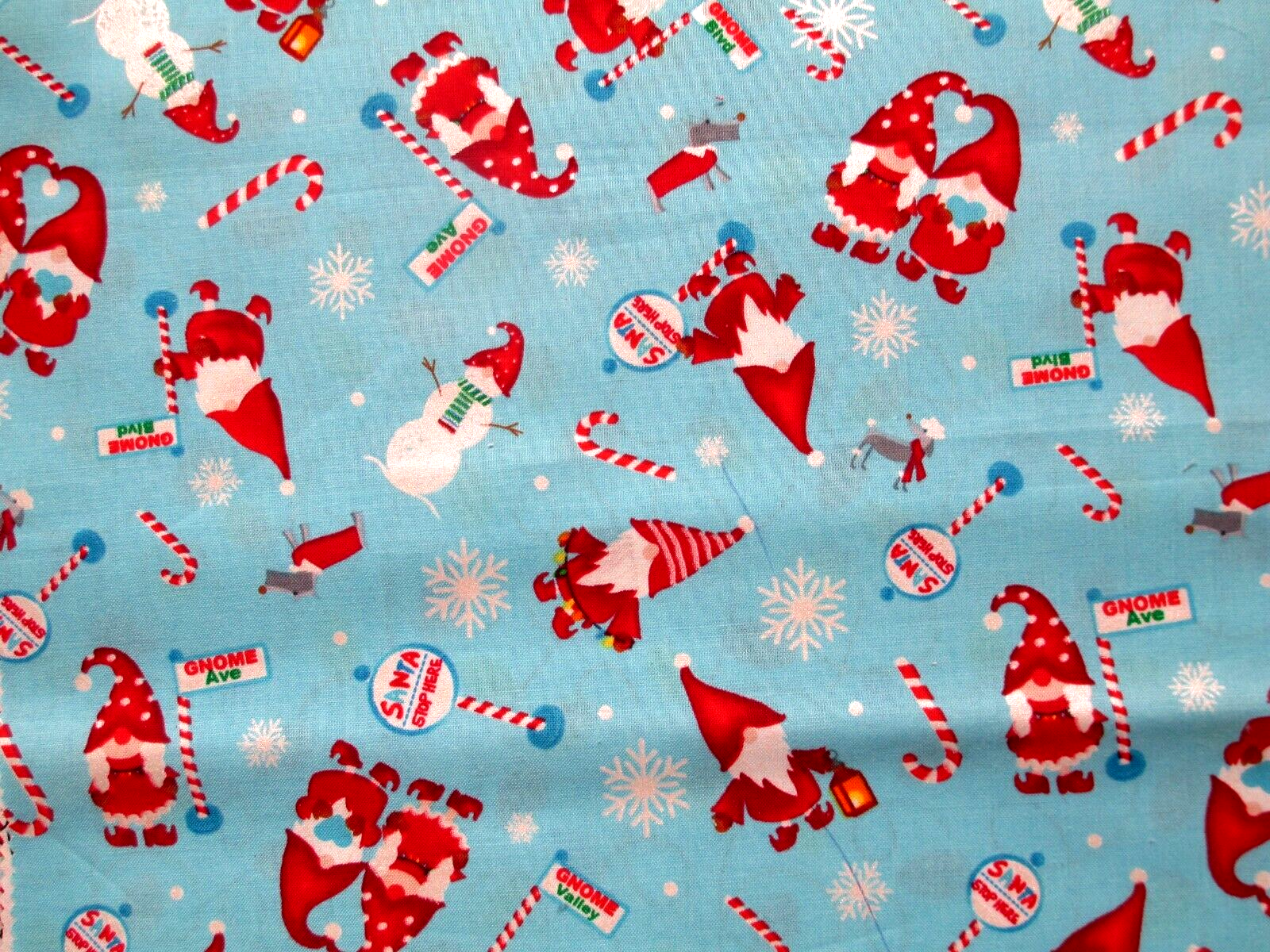 Photo 2 3 - candy canes, gnomes in red and snowmen on baby blue background measuring 12-1/2" x 12";