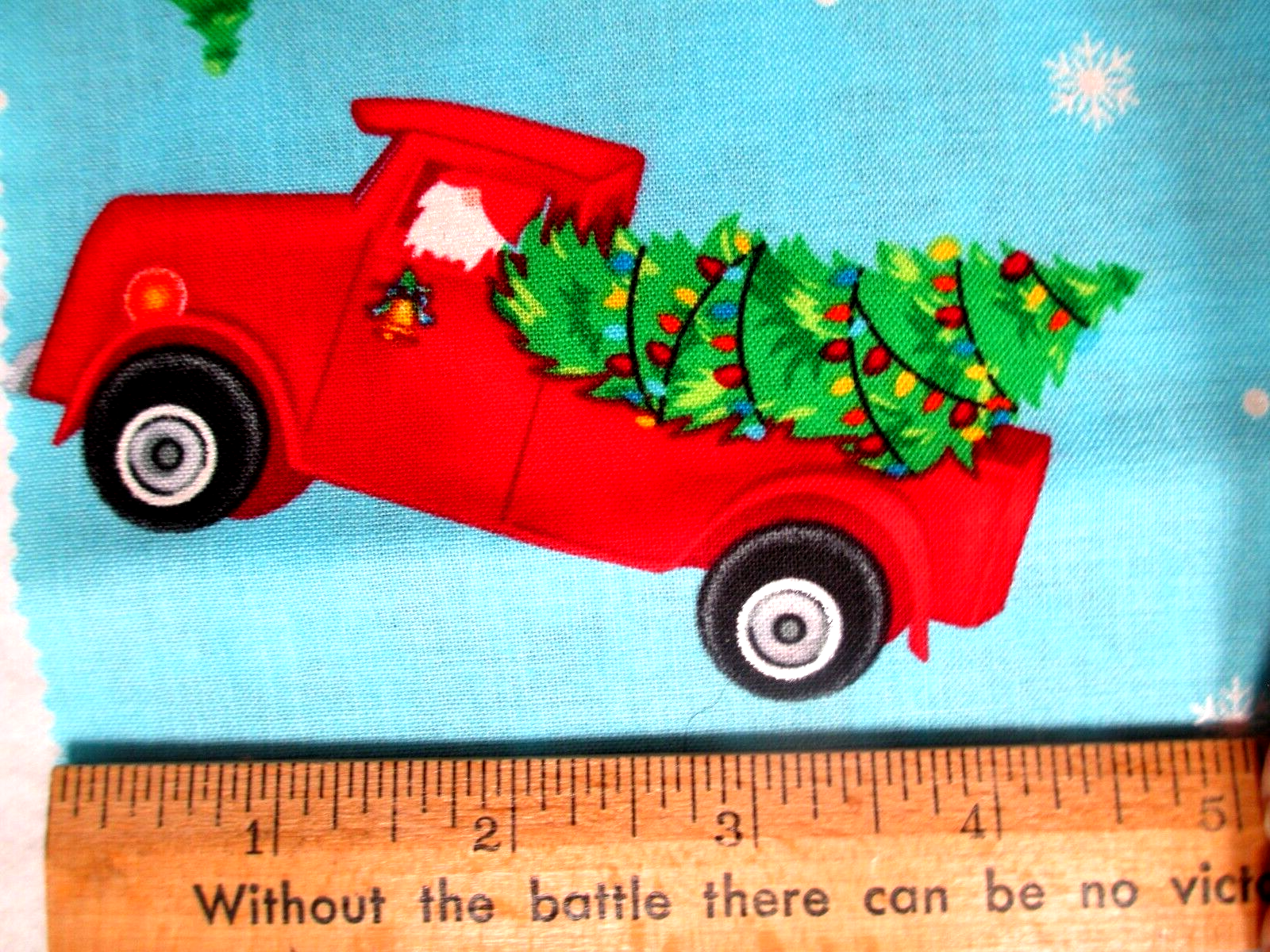 Photo 5 6 - red trucks carrying Christmas trees on medium blue that is 12-1/2" x 14";