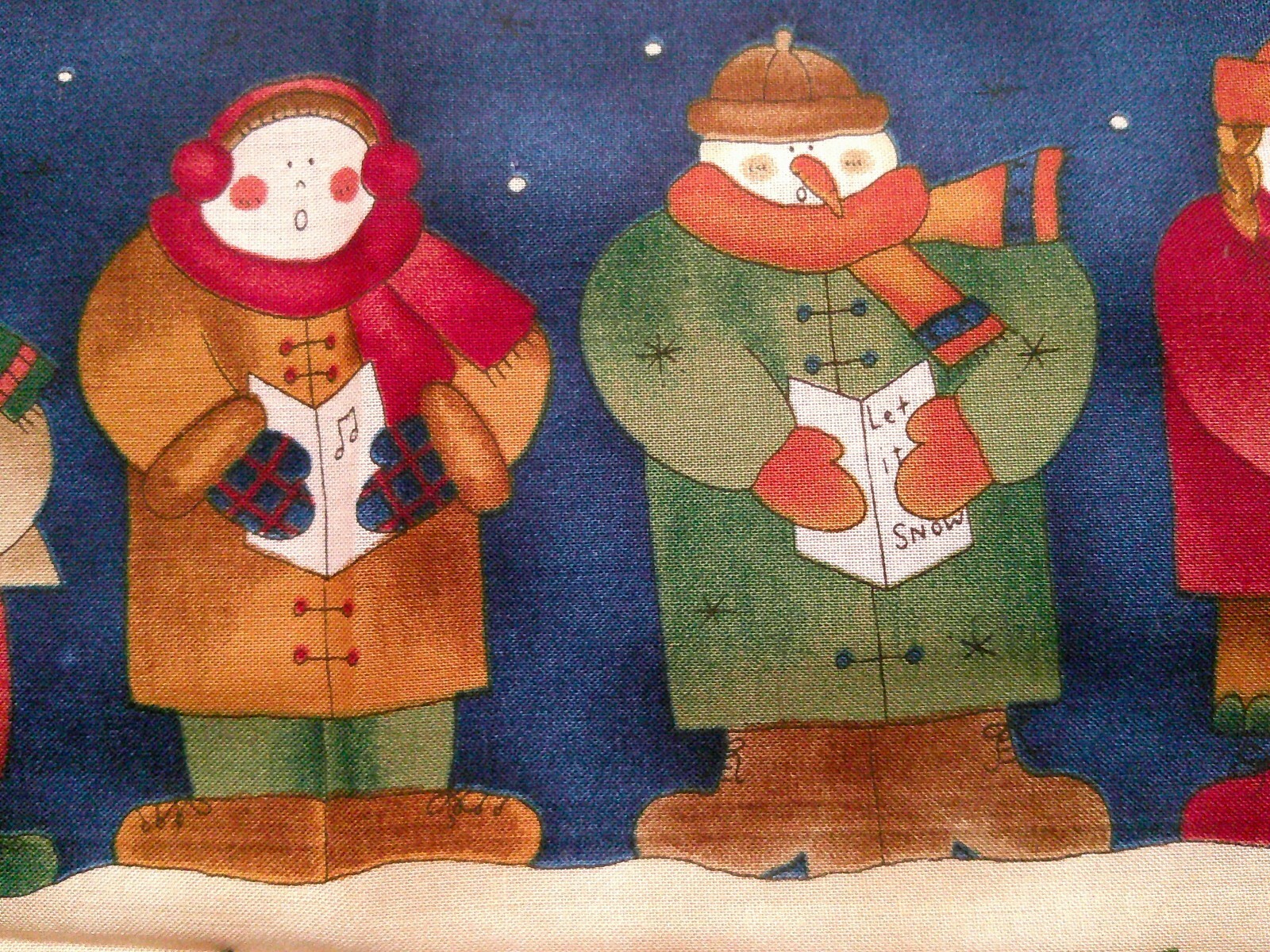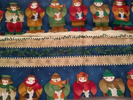 This fabric listing is by Red Rooster called "Caroling", depicting horizontal rows of Christmas carolers separated by snowflakes on tan and holly and ivy on royal blue. This is vintage material measuring 21" x 14" on a royal blue background.