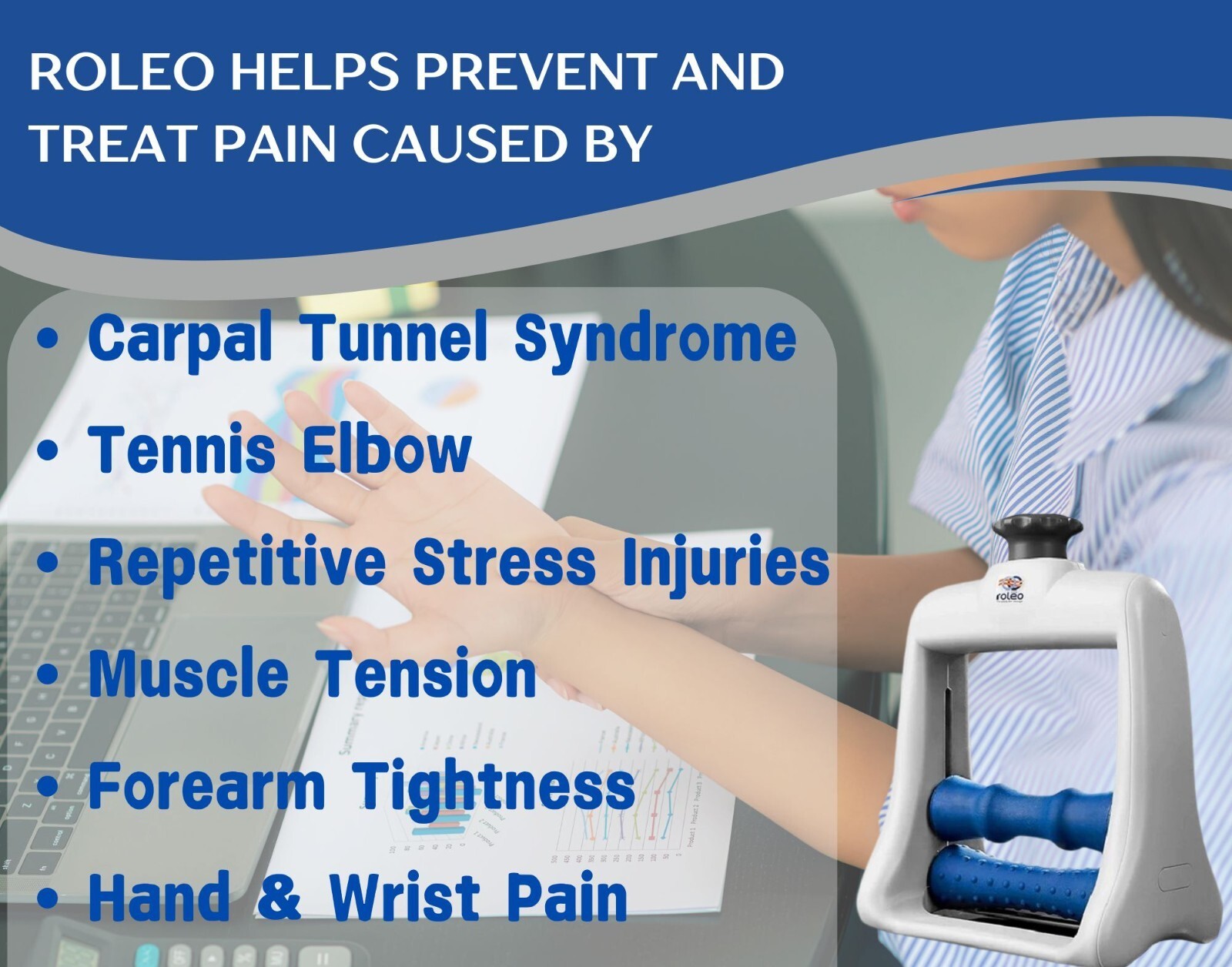 The Roleo PRO Arm Massager is expertly designed to provide relief from Repetitive Stress Injuries (RSI), Carpal Tunnel Syndrome, and Forearm Tendonitis. Invented by a Licensed Massage Therapist, this innovative tool replicates deep tissue massage techniques to help musicians, athletes, office workers, and anyone experiencing hand and wrist pain.