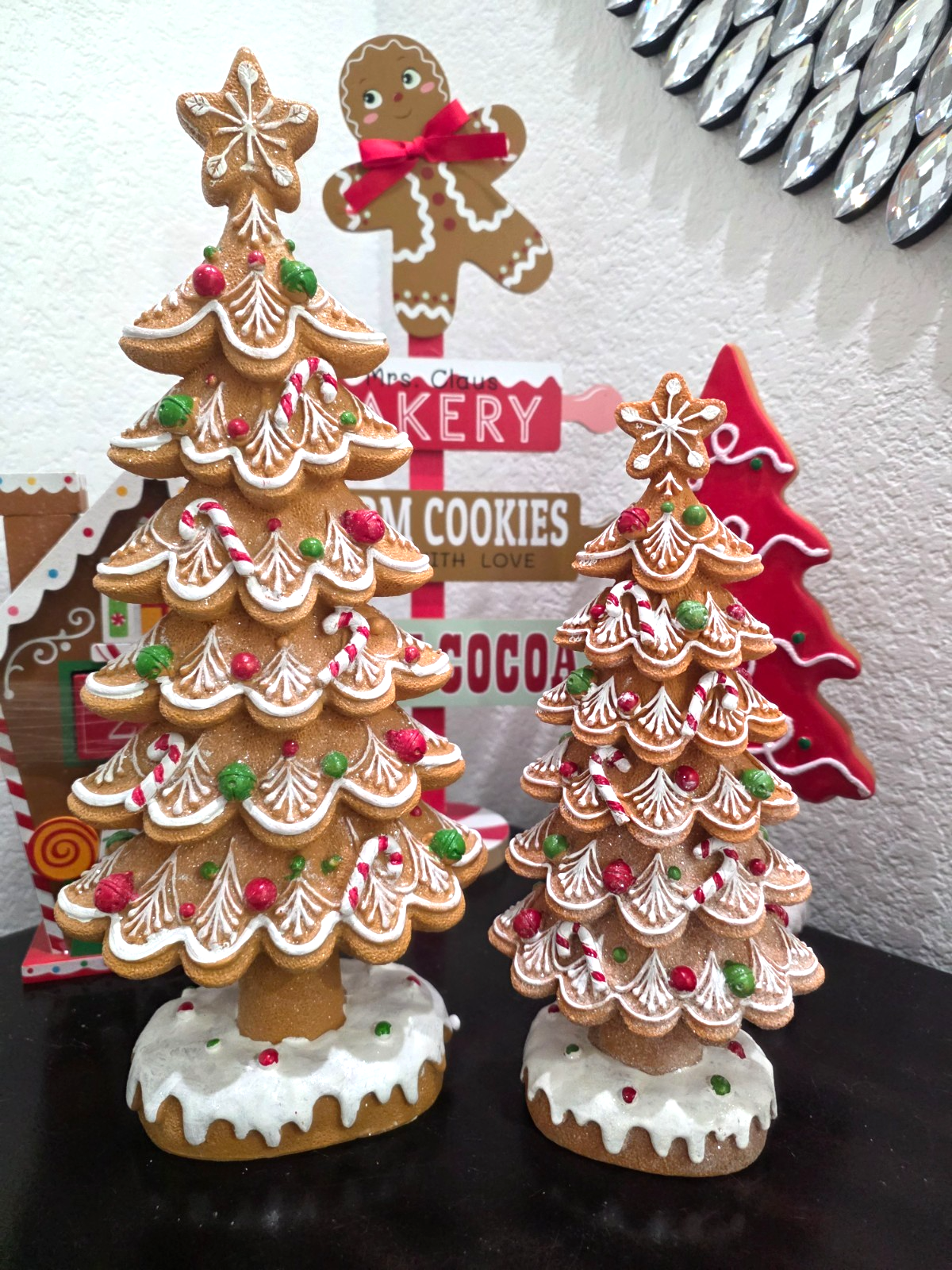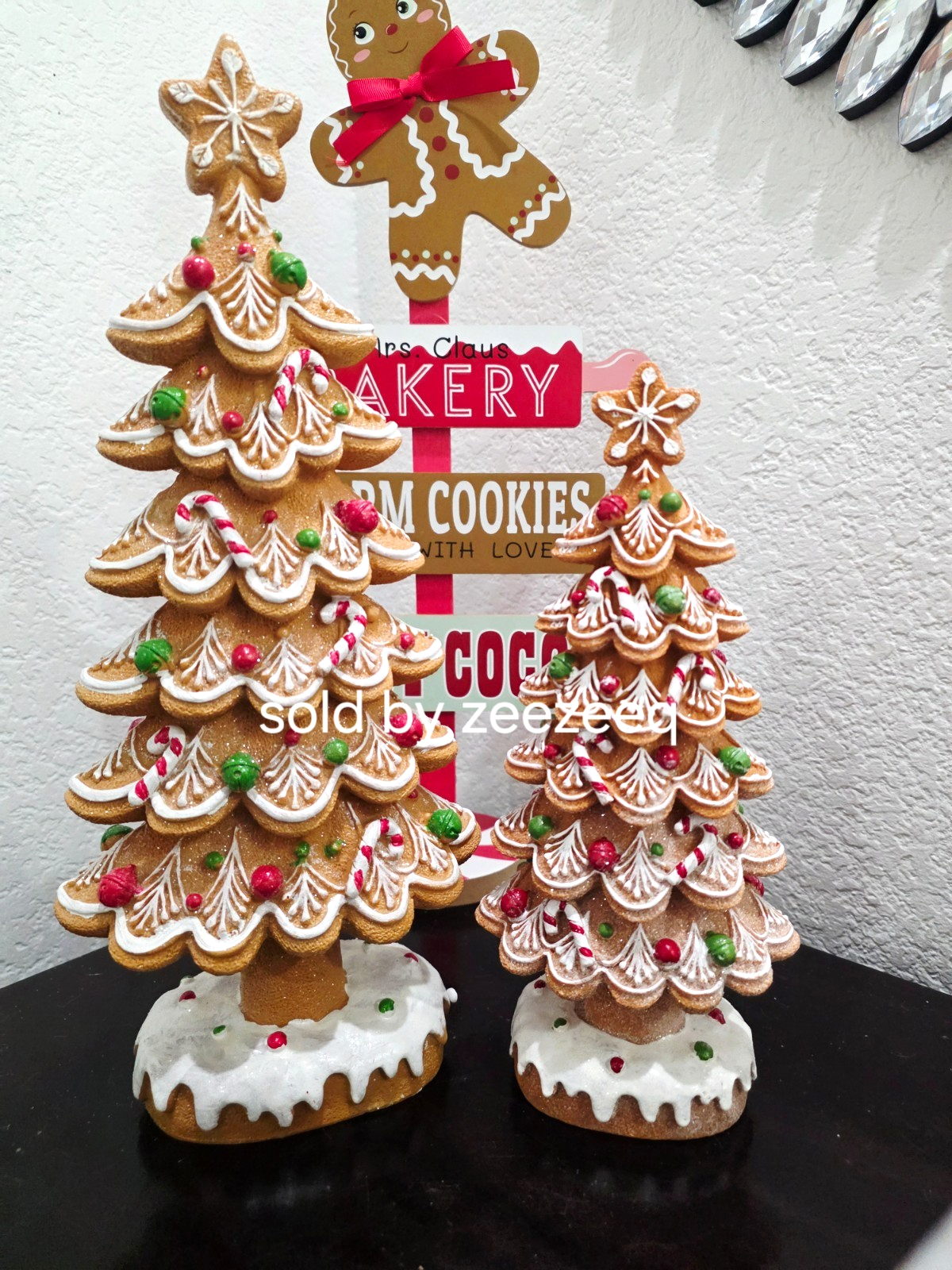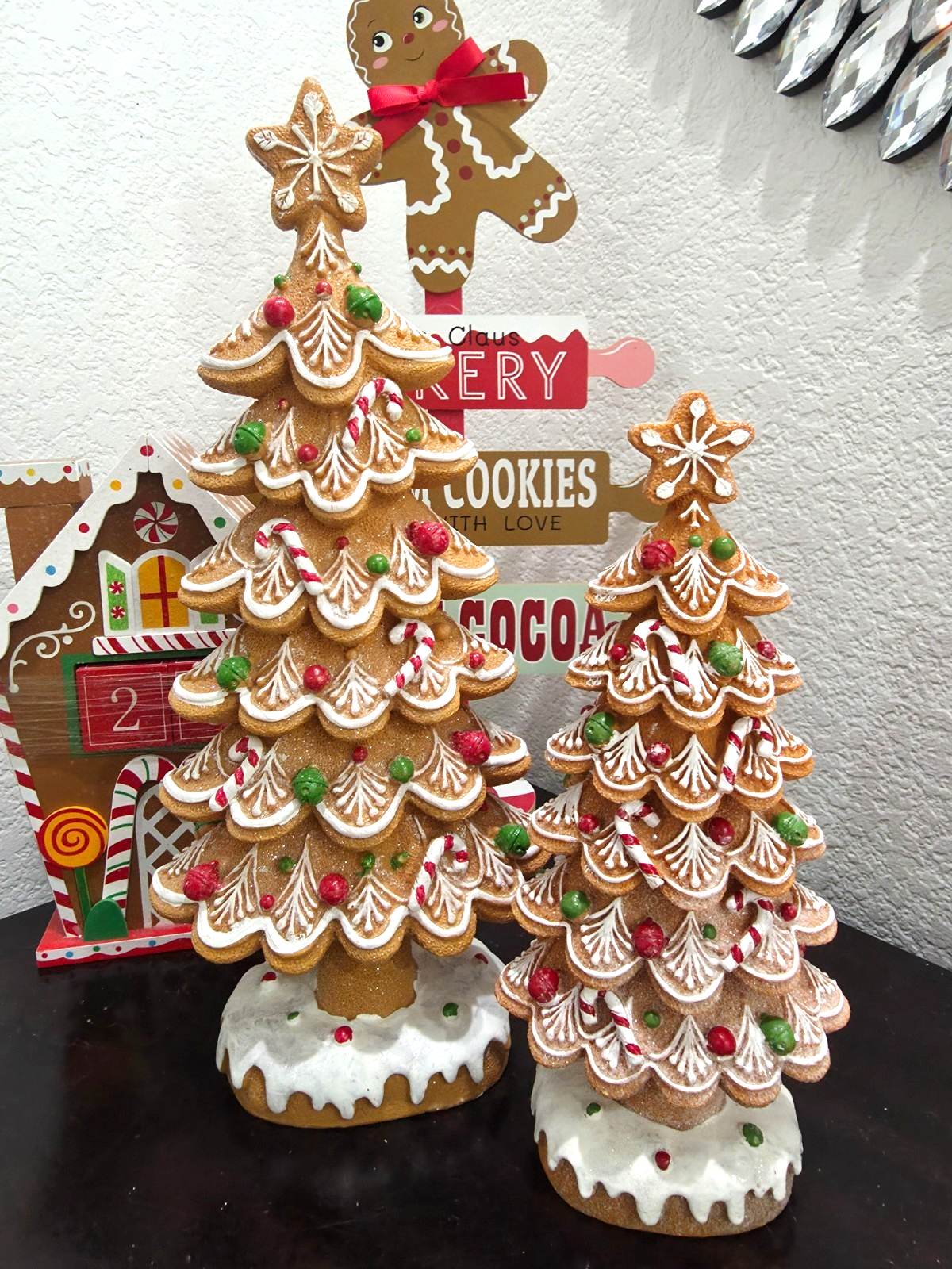 Up for sale we have these 2 adorable gingerbread trees for your tabletop decor. The tree are made of resin and they have red and green ornaments. They stand approx 15" 11" tall. NEW.