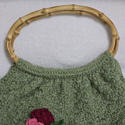 Vintage Cottagecore Green Crochet Handbag w/ Bamboo Handles & Floral Detail
