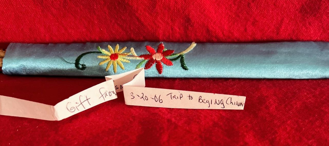Vintage New Lacquered Chopsticks Geisha Design w Blue Fabric Embroidered Case