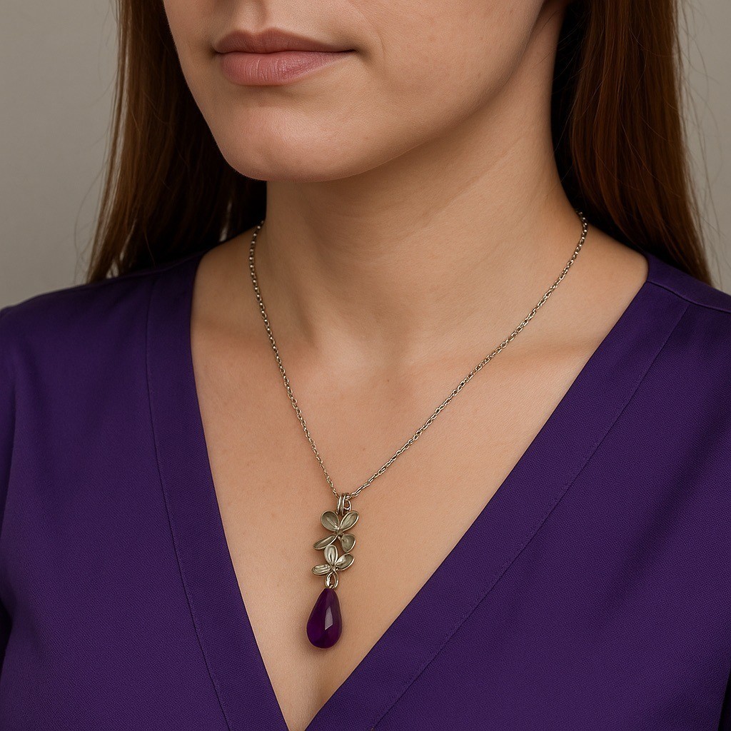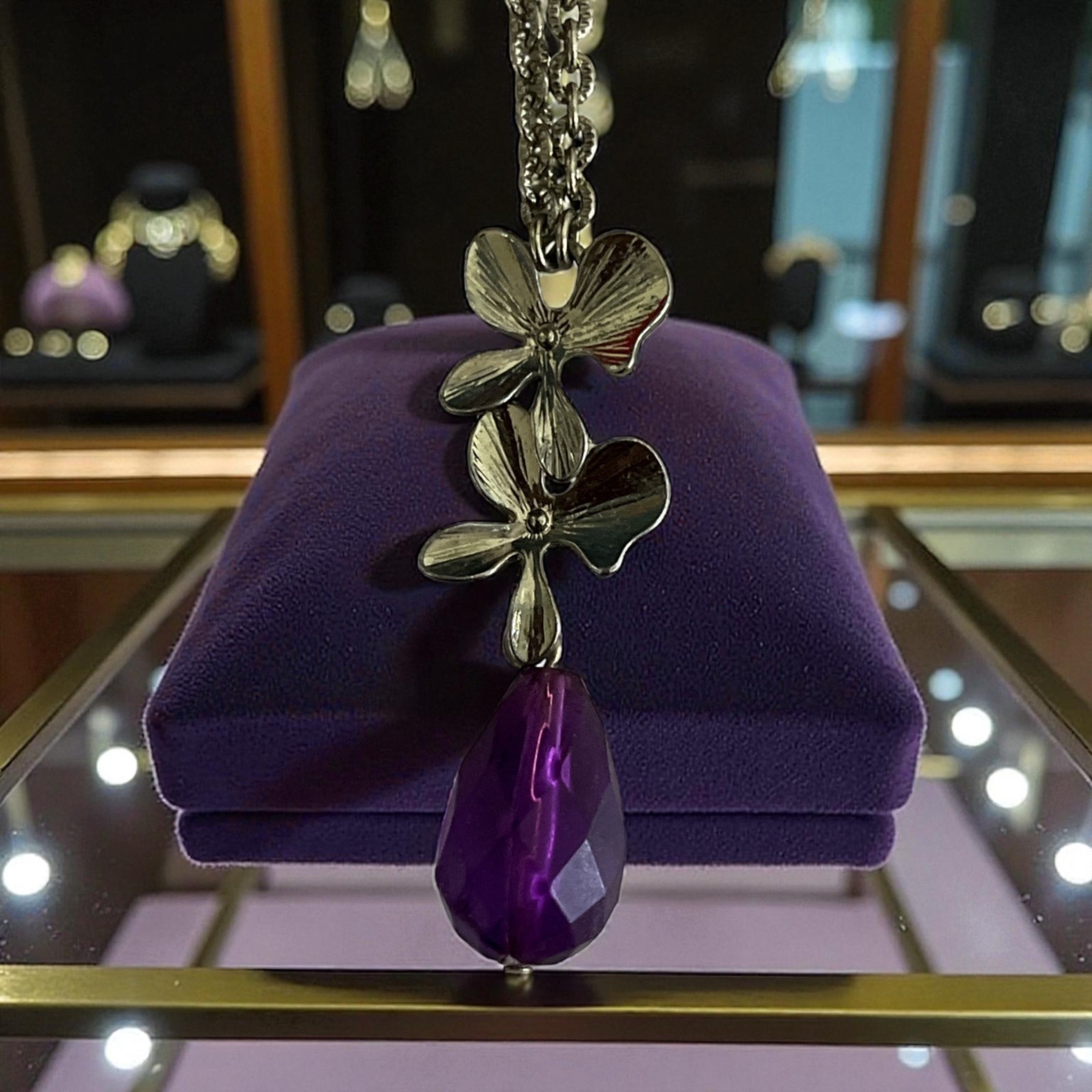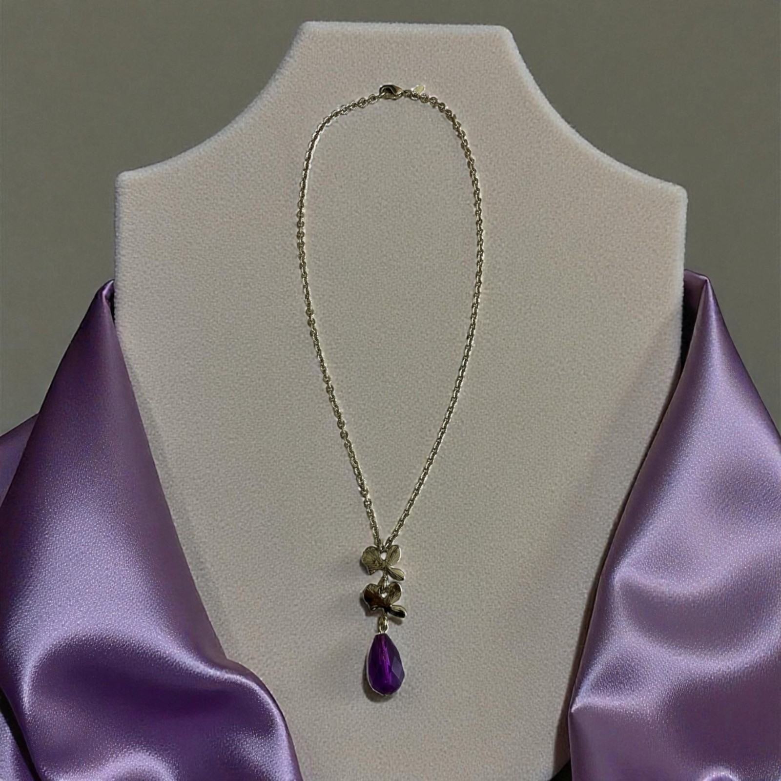 Elegant silver-tone necklace featuring a double-flower pendant and a faceted purple teardrop charm. The delicate floral design adds a romantic, feminine touch, while the amethyst-colored drop brings a bold pop of color. Perfect for both formal and everyday wear.
