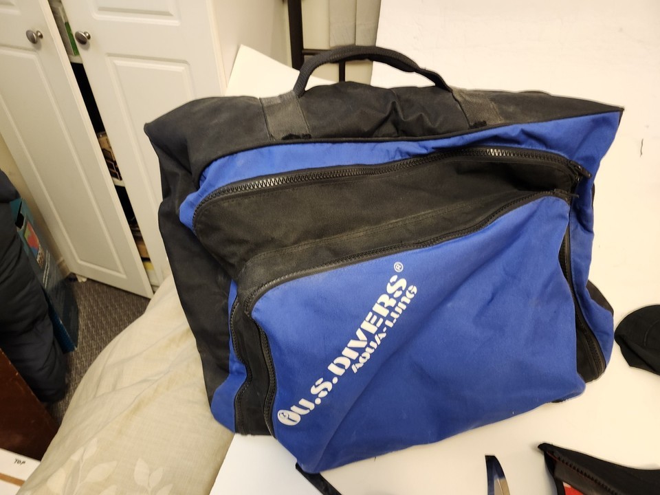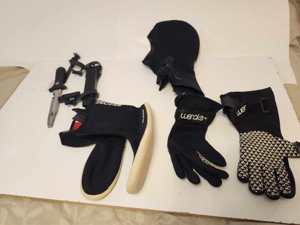 For immediate purchase is this Scuba Diving Accessory Lot Boots, Gloves, Knife, Bag, cap Wenoka US Divers USED. This lot includes everything in photos, used but good condition, boots fit like a L-XL, Gloves are size Large. Cap is XL, shows some wear. Knife may have had a rubber cap on end which is no longer there.
