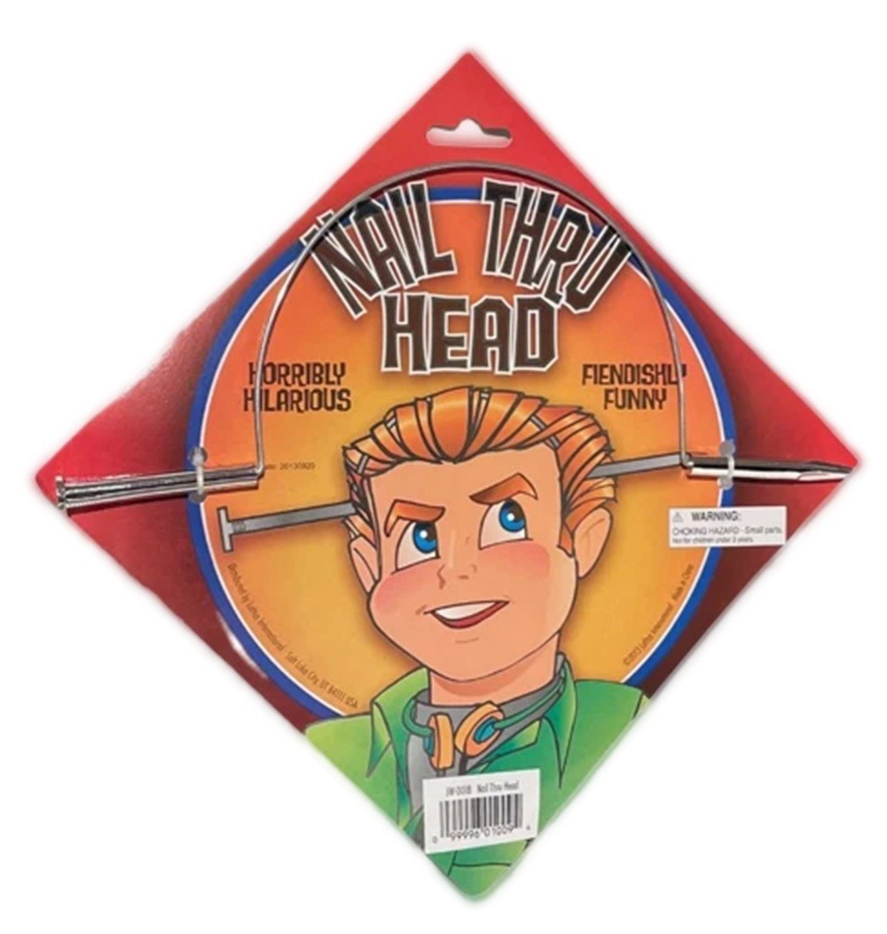Add some fake blood and gore to this funny pierced head toy, give as gruesome Halloween party prizes and fancy dress events. Looks real, great to fool your friends. This nail through the head magic trick toy is the perfect zombie monster maker and costume accessory.