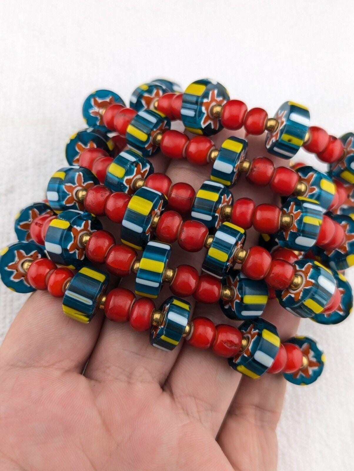 L'antico bracciale veneziano rosso mirtillo bianco con perle chevron a cuore da 8 mm presenta uno stile di perline di ispirazione africana con una pietra principale in vetro rosso. Il bracciale e progettato con accenti di metallo bronzo ed e adatto sia per uomini che per donne. Originario della Repubblica Ceca, questo bracciale presenta una miscela unica di artigianato tradizionale e design moderno, rendendolo un'aggiunta distintiva a qualsiasi collezione di gioielli.