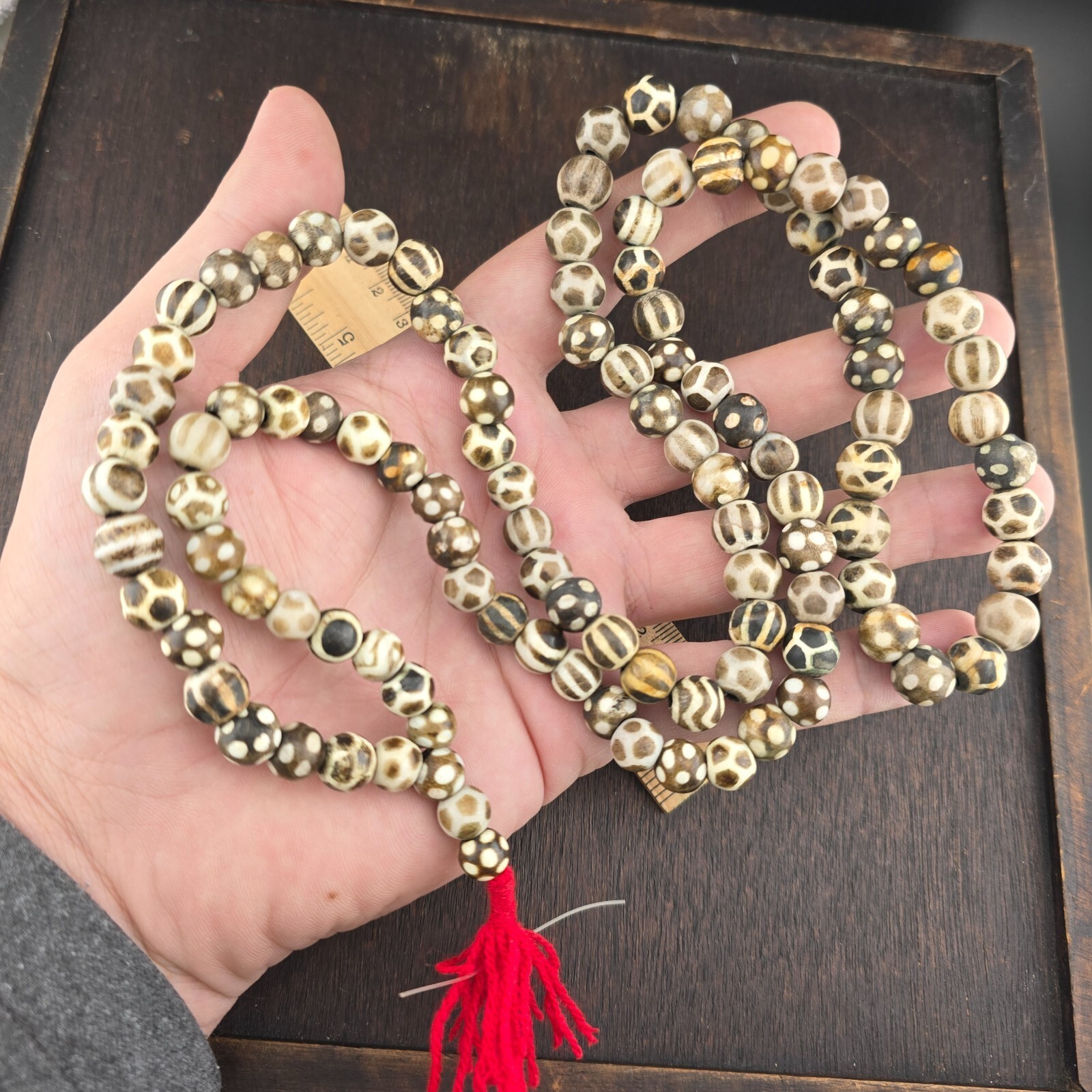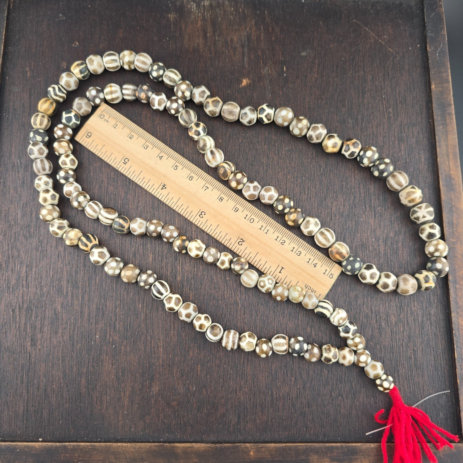 Asiatische Burmese Old Pumtek versteinerte Holz Stein Perlen Lange Halskette seltenes Muster