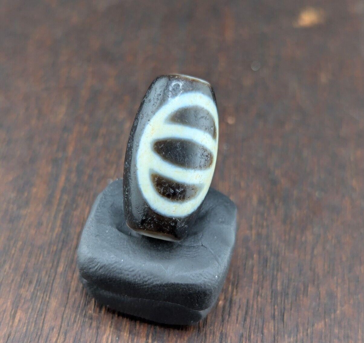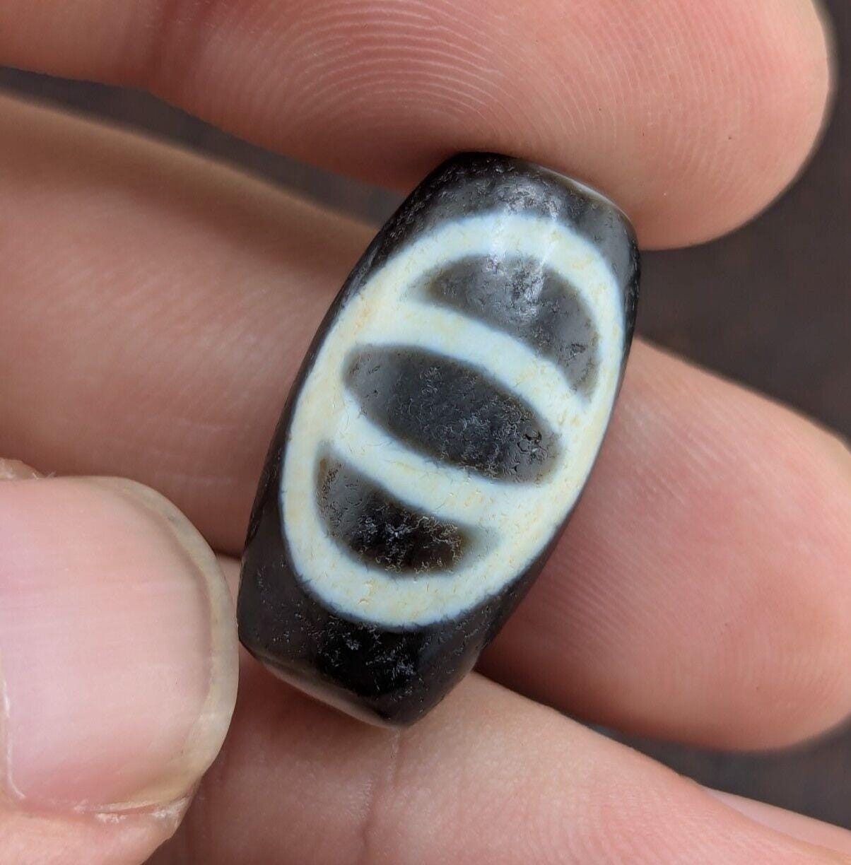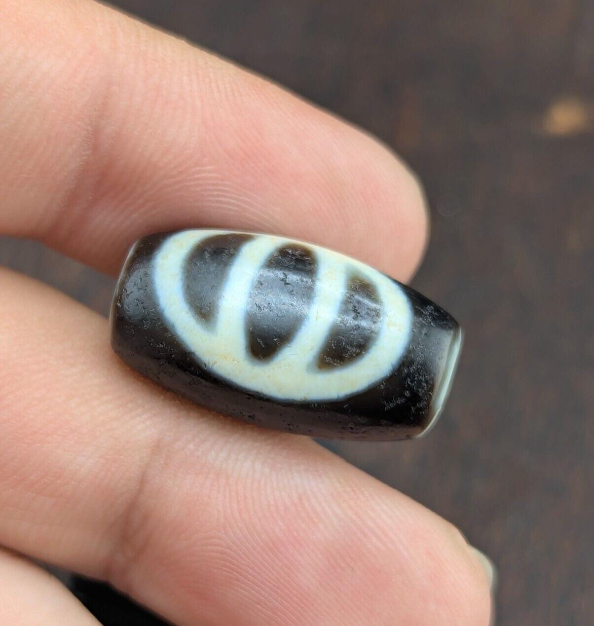 Questo amuleto vintage e realizzato in agata bianca e nera con un motivo unico Occhi, originario del Tibet. E una perlina DZI con un design distintivo, probabilmente utilizzata per scopi spirituali o protettivi.